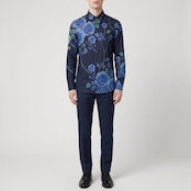 深みのあるネイビーに咲き誇る青い薔薇と、緑から青へと変化する葉のグラデーションが幻想的な美しさを放つ一着です。