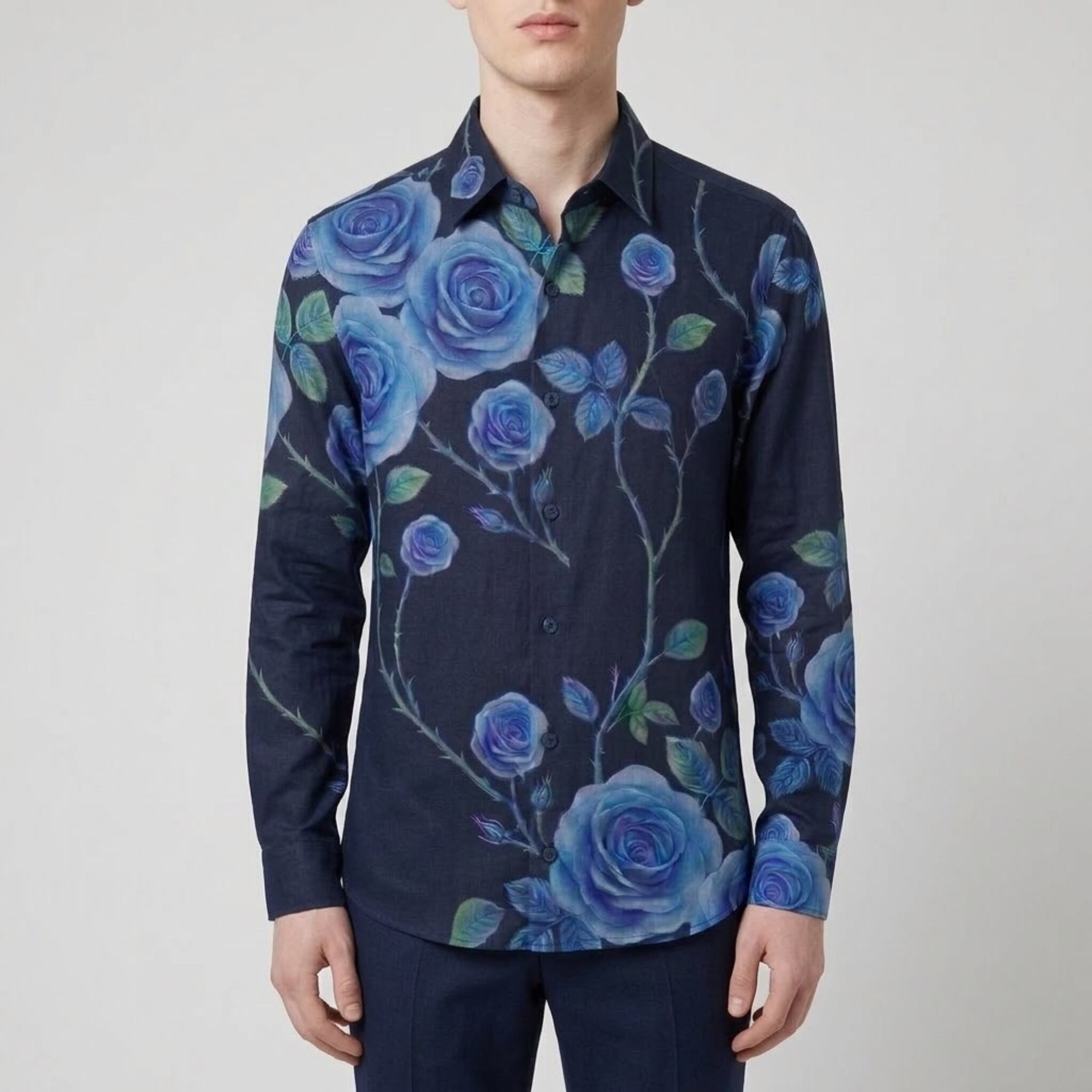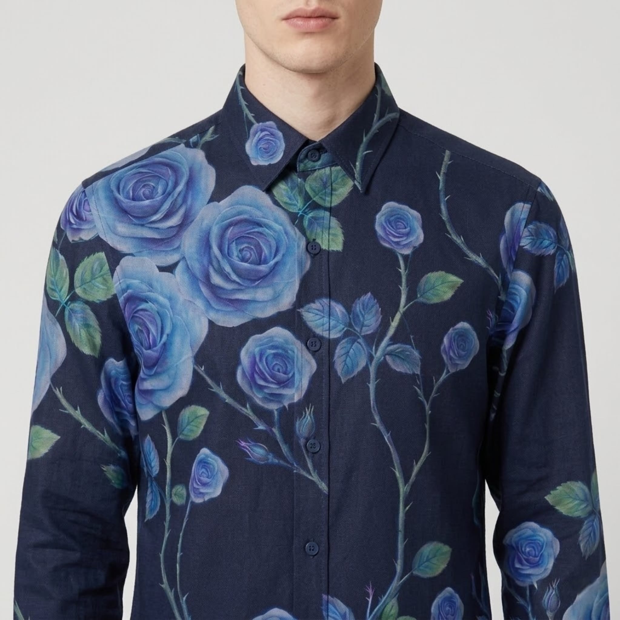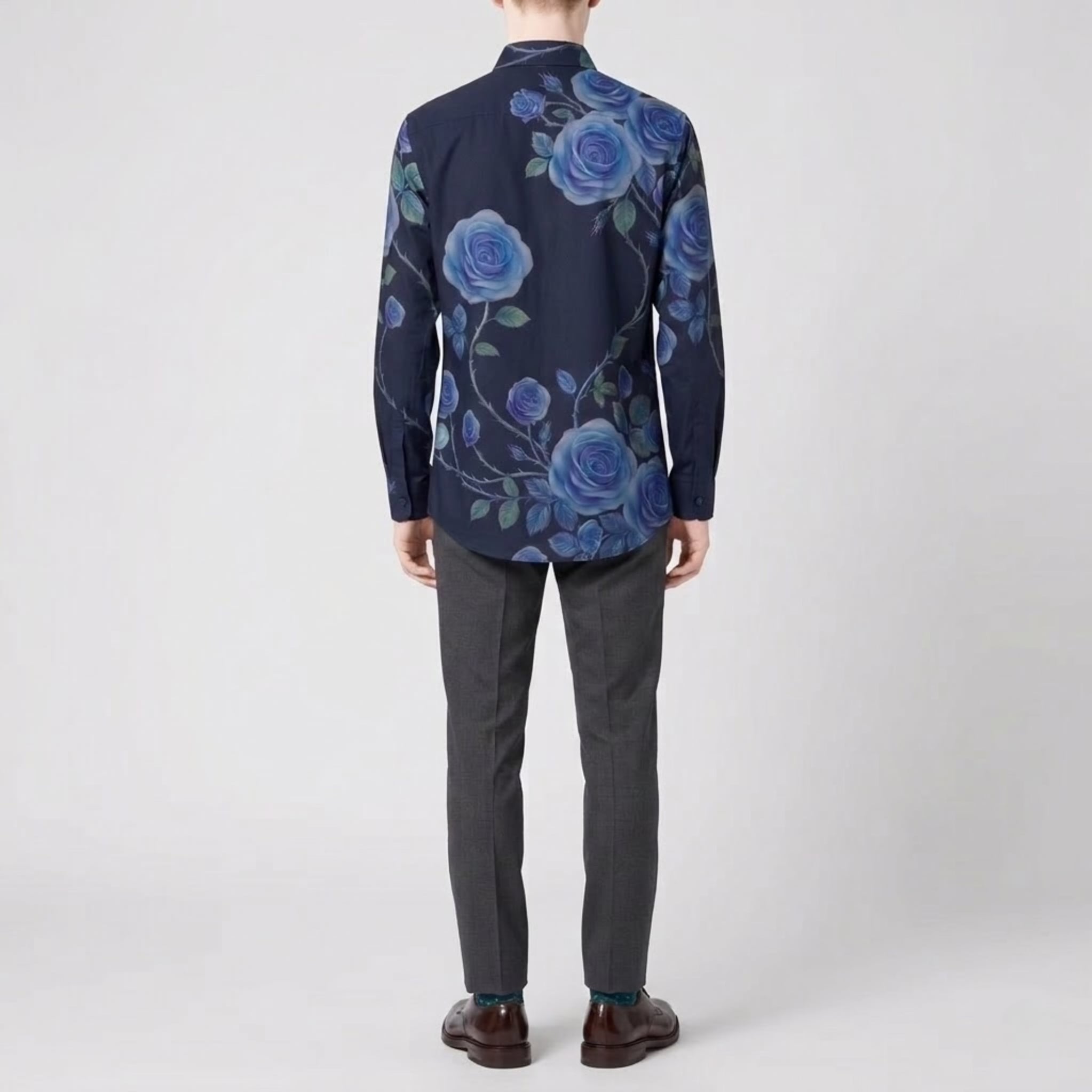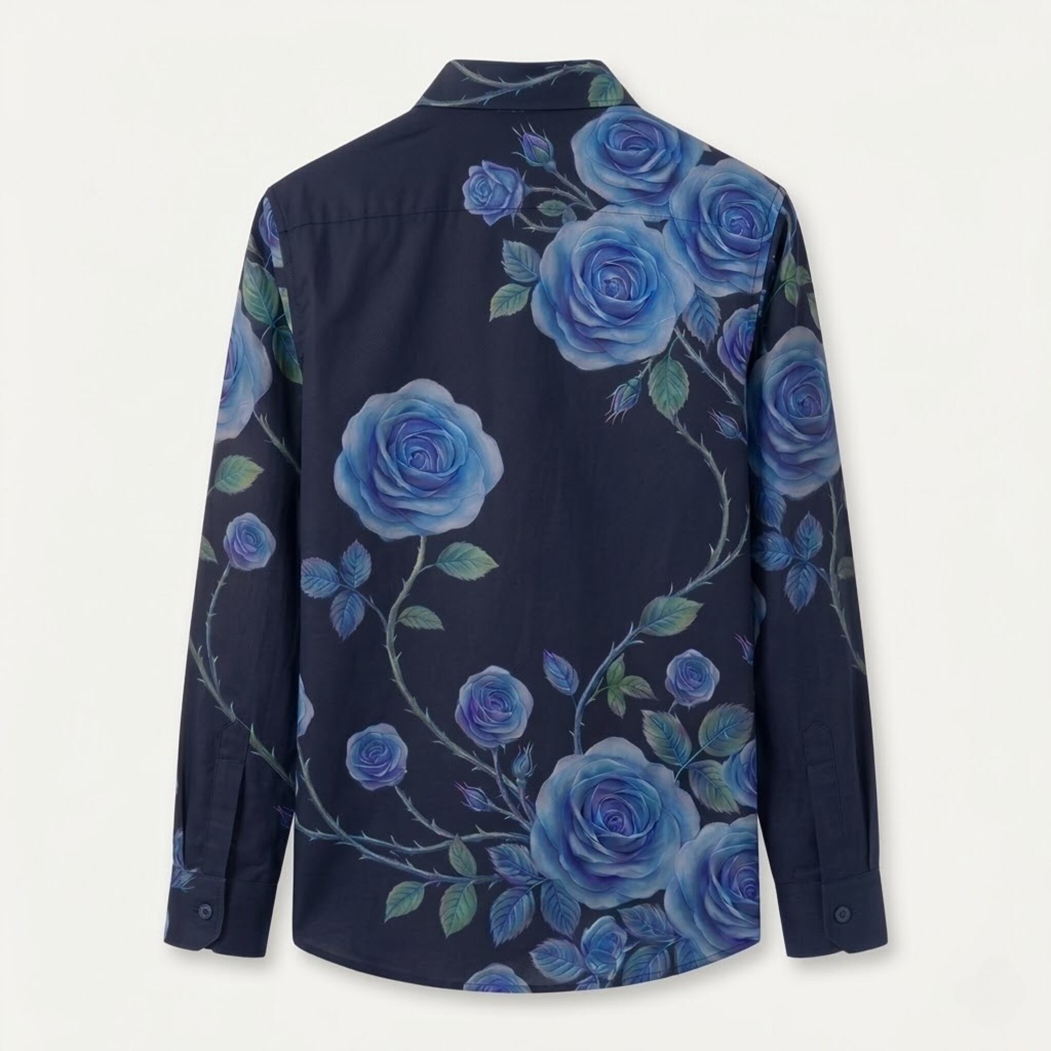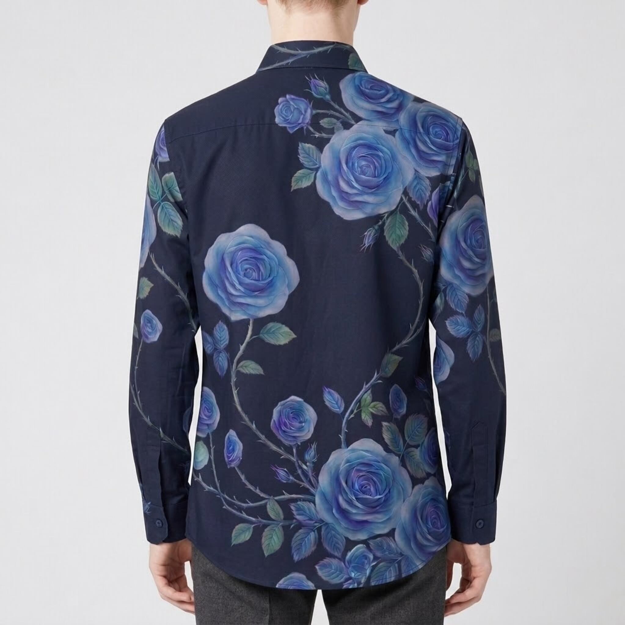青い薔薇と緑から青のグラデーションの葉やトゲ付き枝が美しい メンズ カジュアルシャツ 長袖 オーダーメイド
