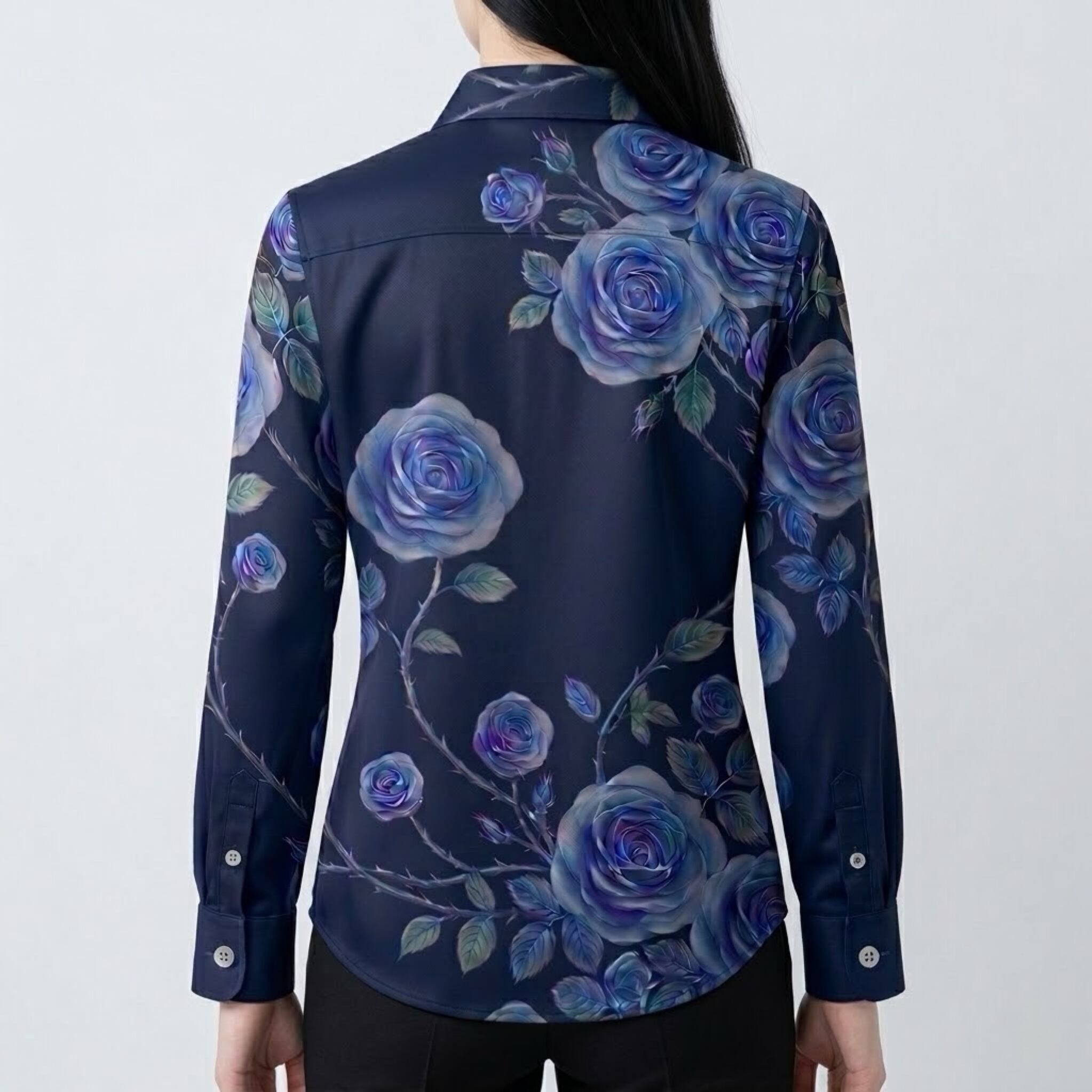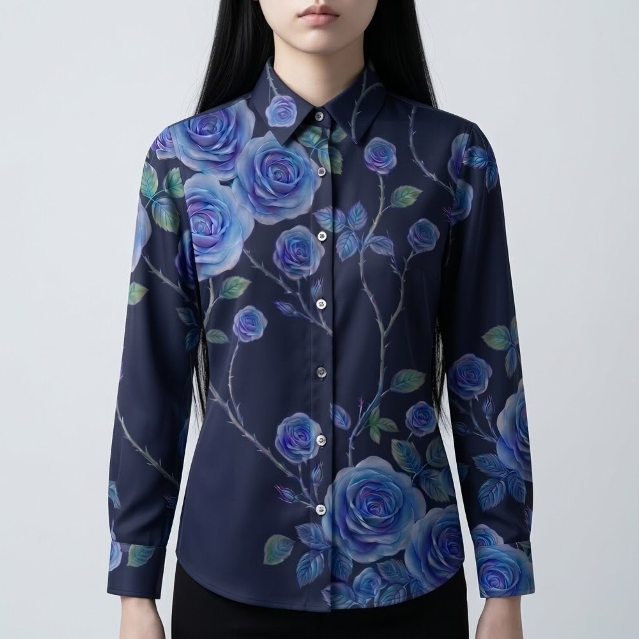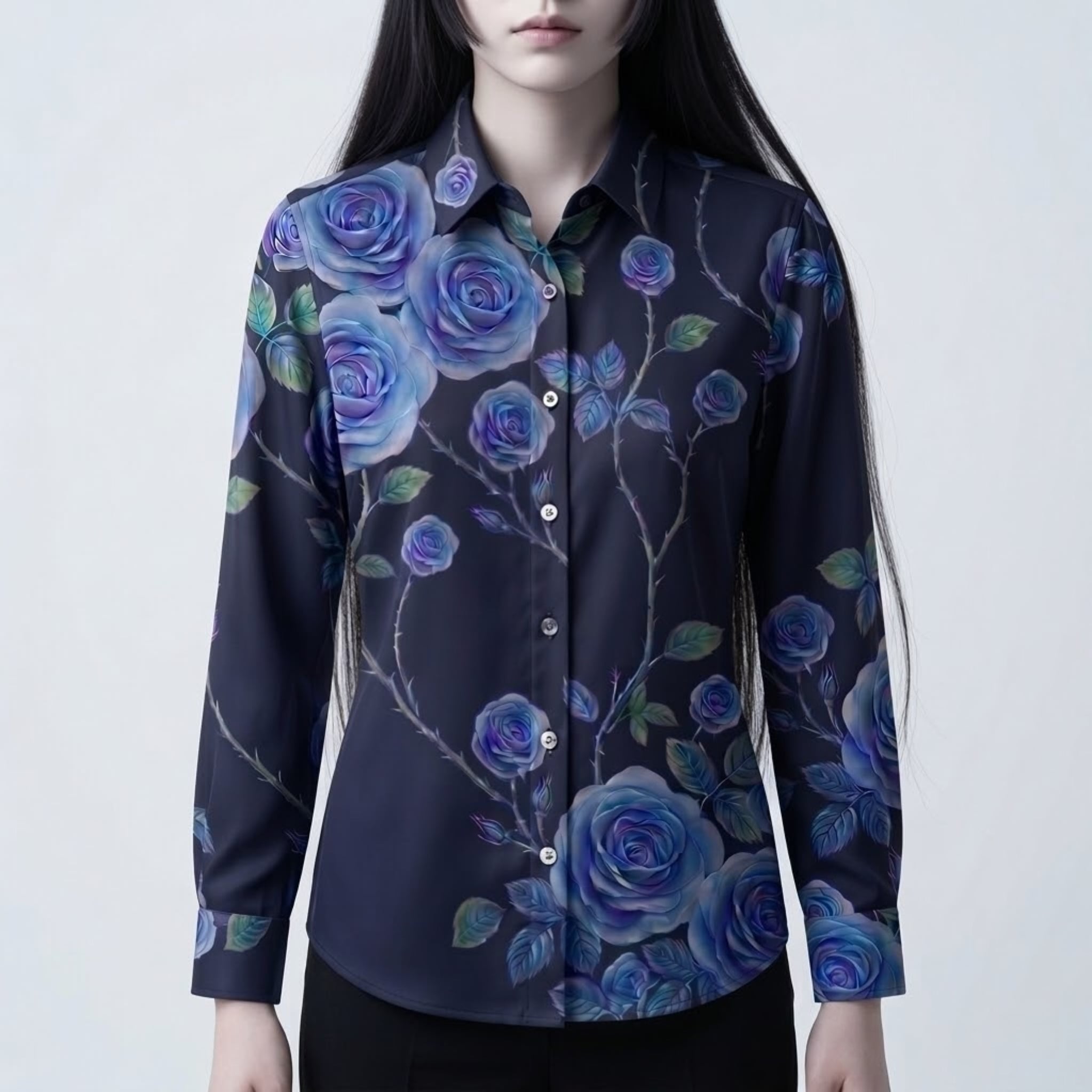 青い薔薇と緑から青のグラデーションの葉やトゲ付き枝が美しい レディース カジュアルシャツ 長袖 オーダーメイド