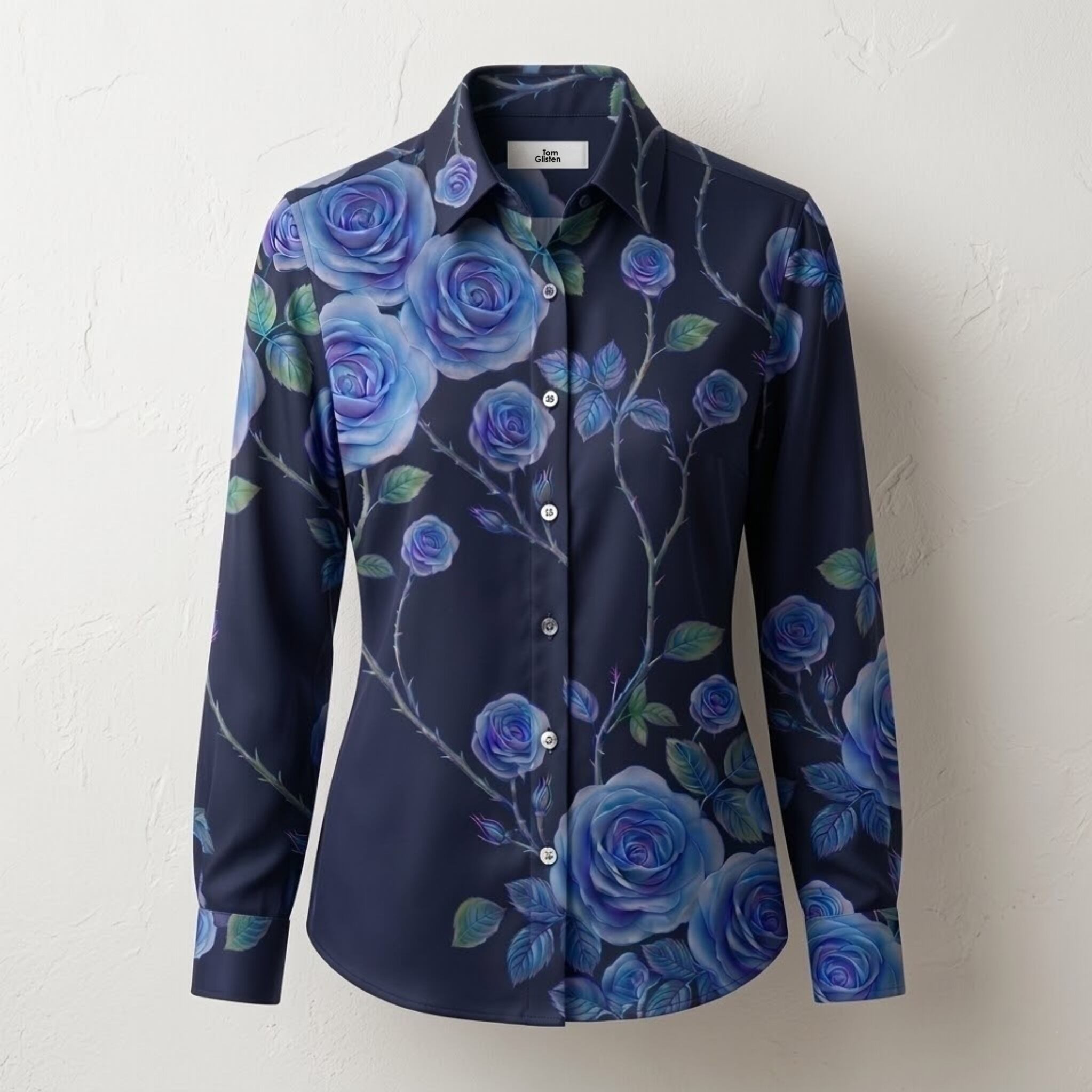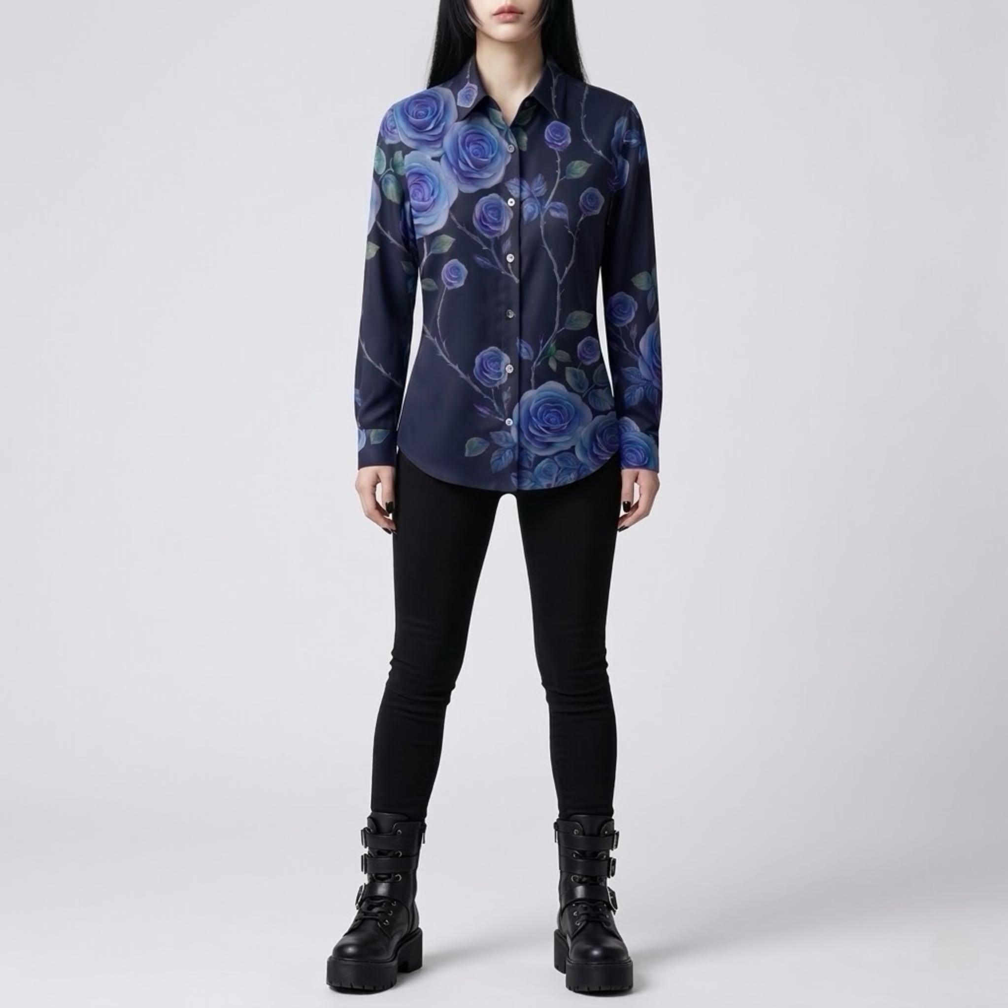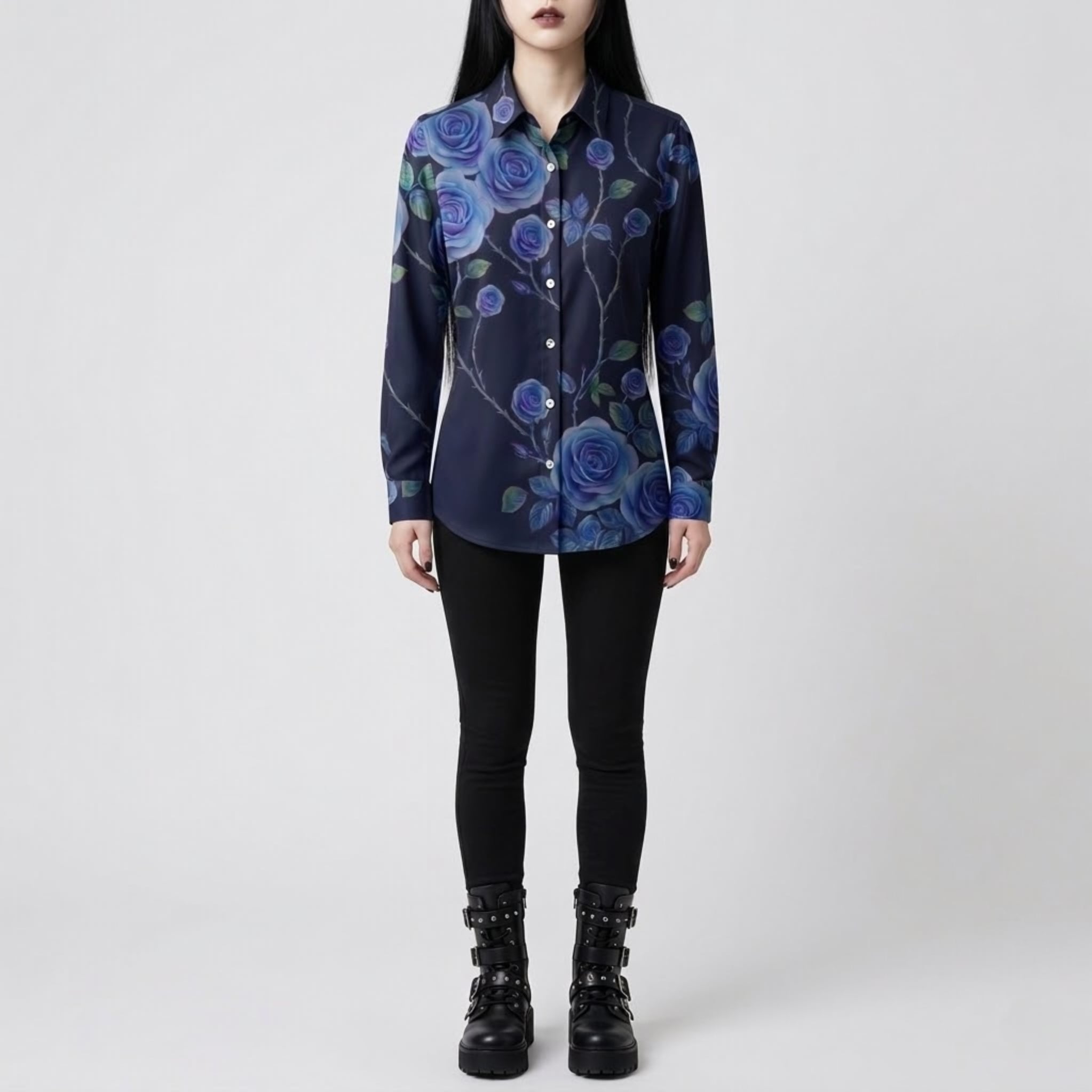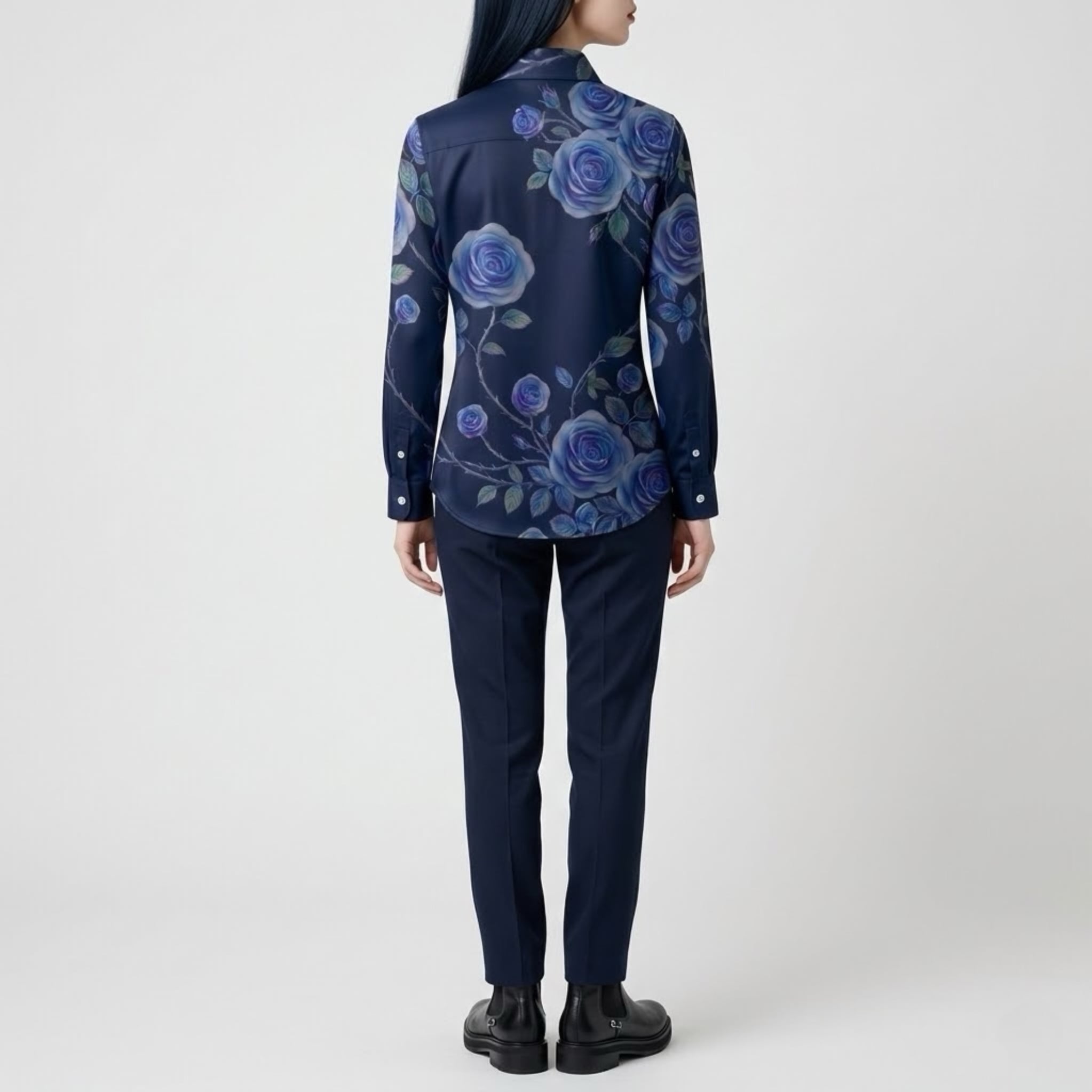 青い薔薇と緑から青のグラデーションの葉やトゲ付き枝が美しい レディース カジュアルシャツ 長袖 オーダーメイド