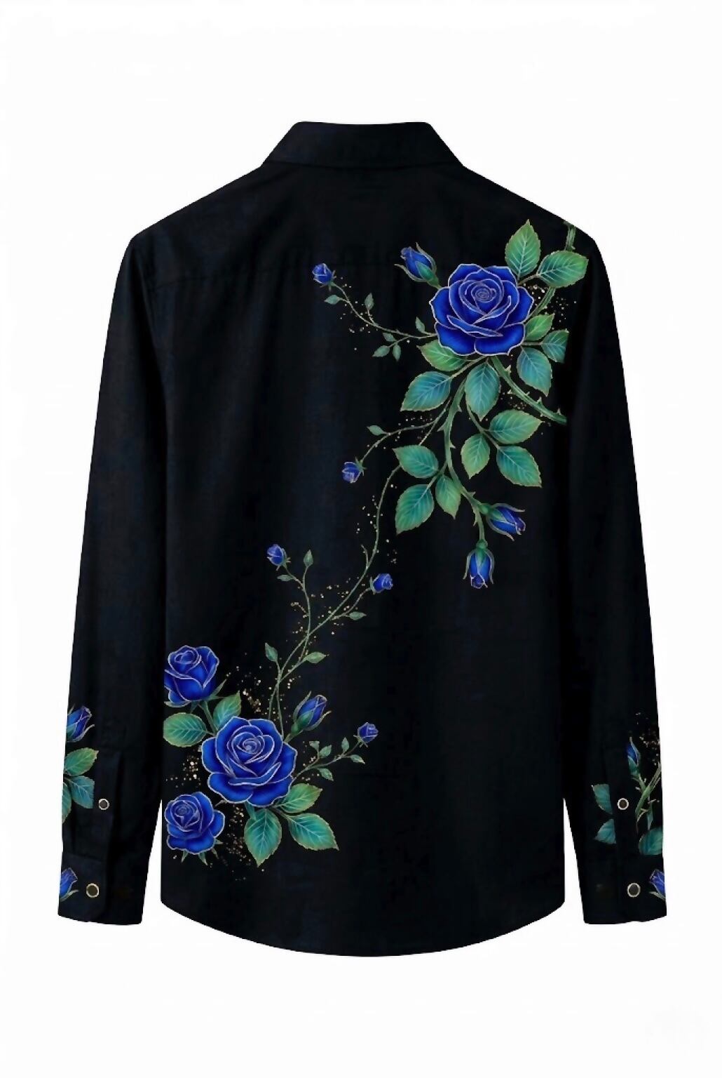 エジプトの秘宝を彷彿とさせる青い薔薇やグラデーションの葉やトゲ付き枝と砂漠の金粉が漆黒の夜に光る メンズ カジュアルシャツ 長袖 オーダーメイド