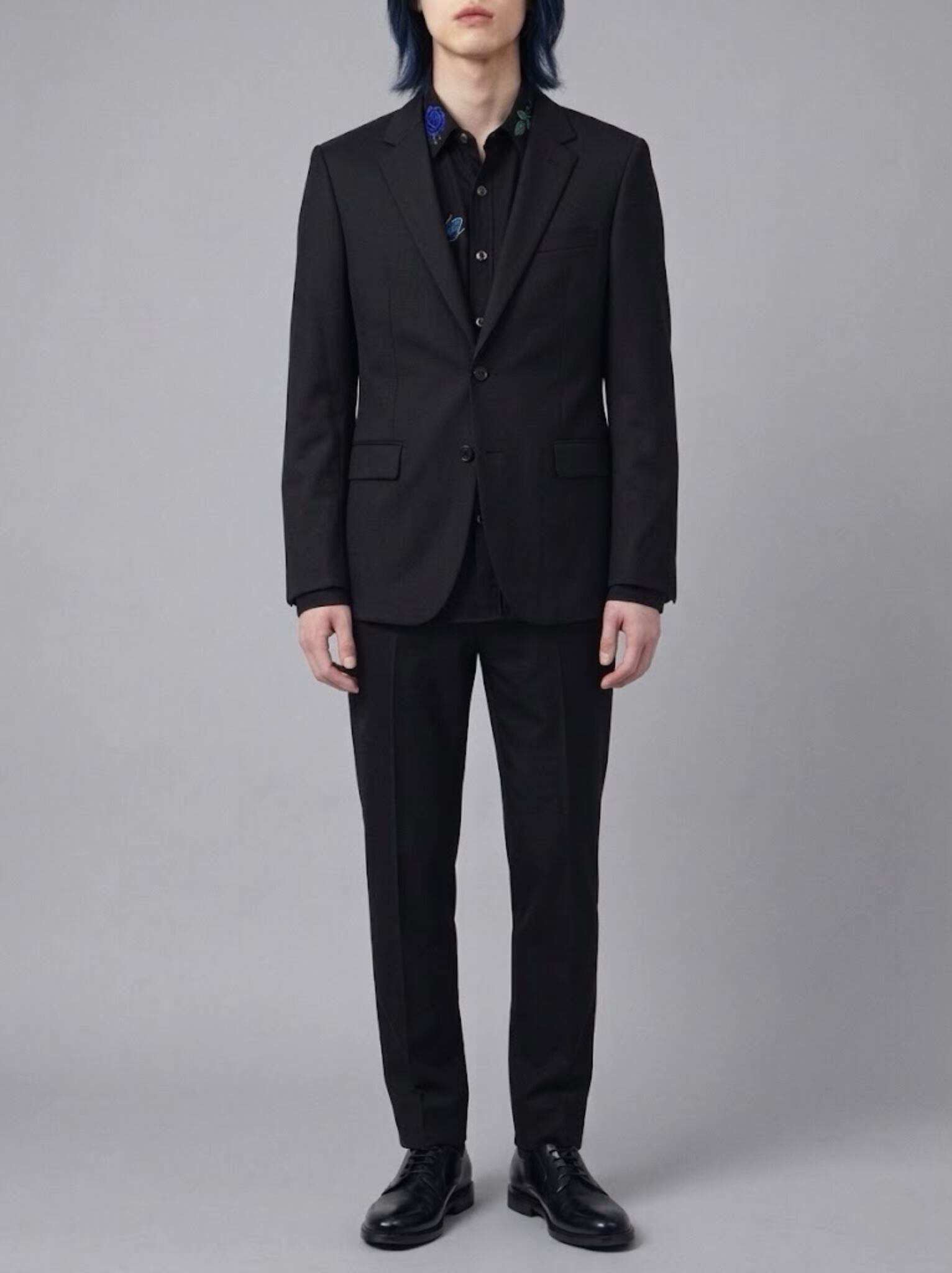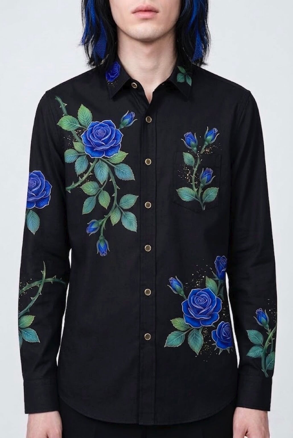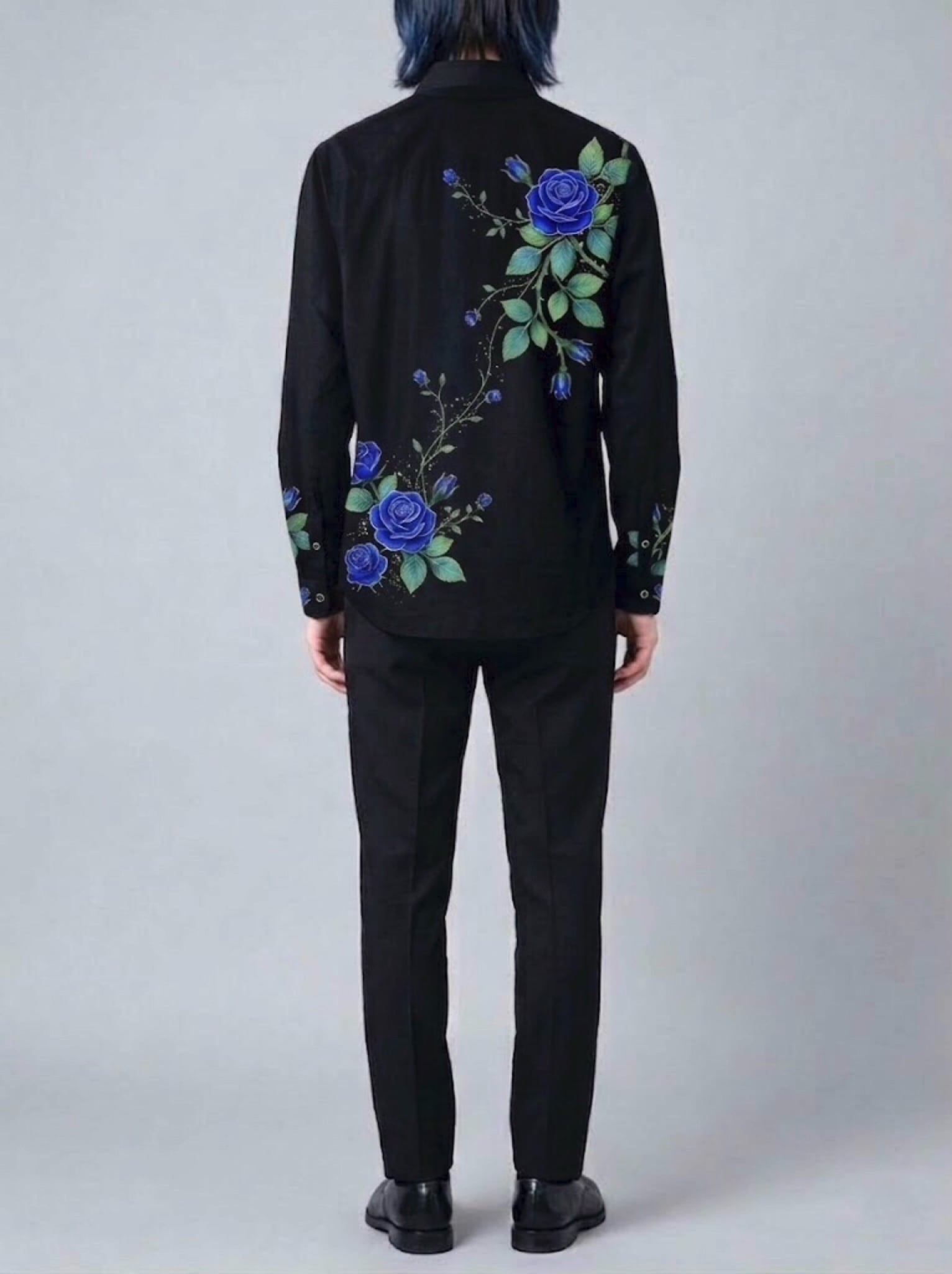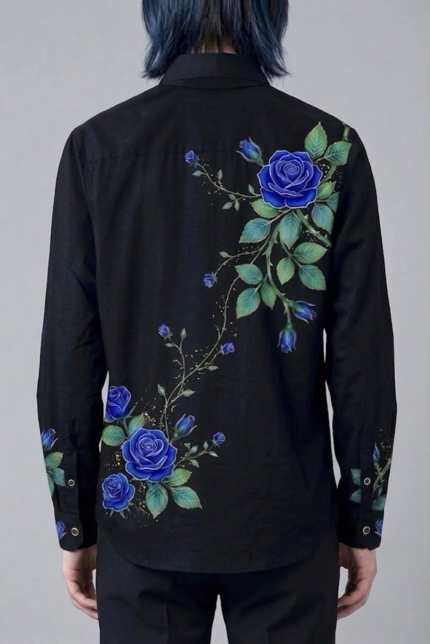 真っ黒な闇のような生地をキャンバスに、あざやかな青い薔薇を主役にした、特別なオーダーメイドシャツです。