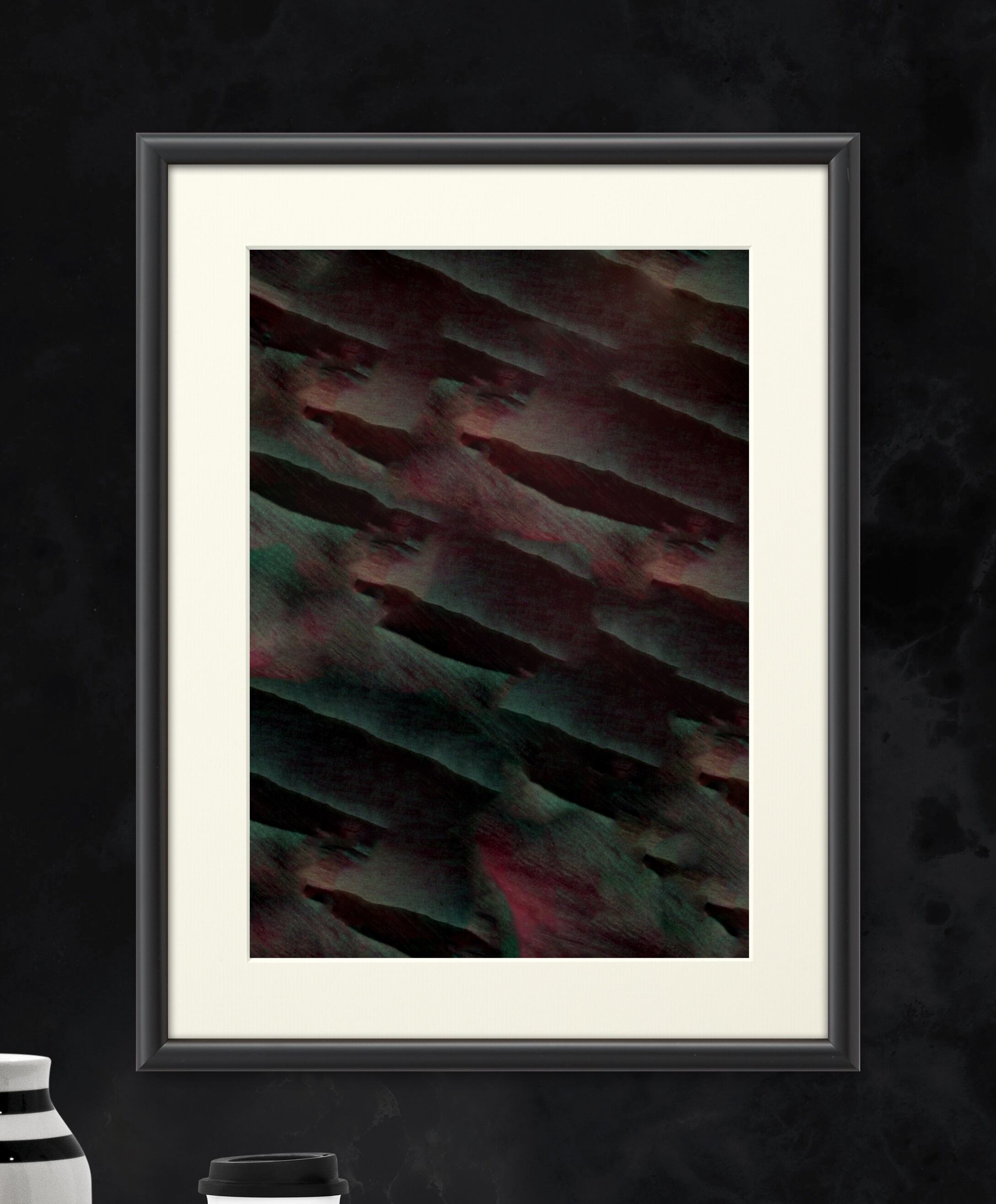 独特な色のオーラで溢れるダークで暗闇の異世界や宇宙空間の中で、斜めに飛び交う無数の黒い謎の人影が神秘的な雰囲気を感じさせます。