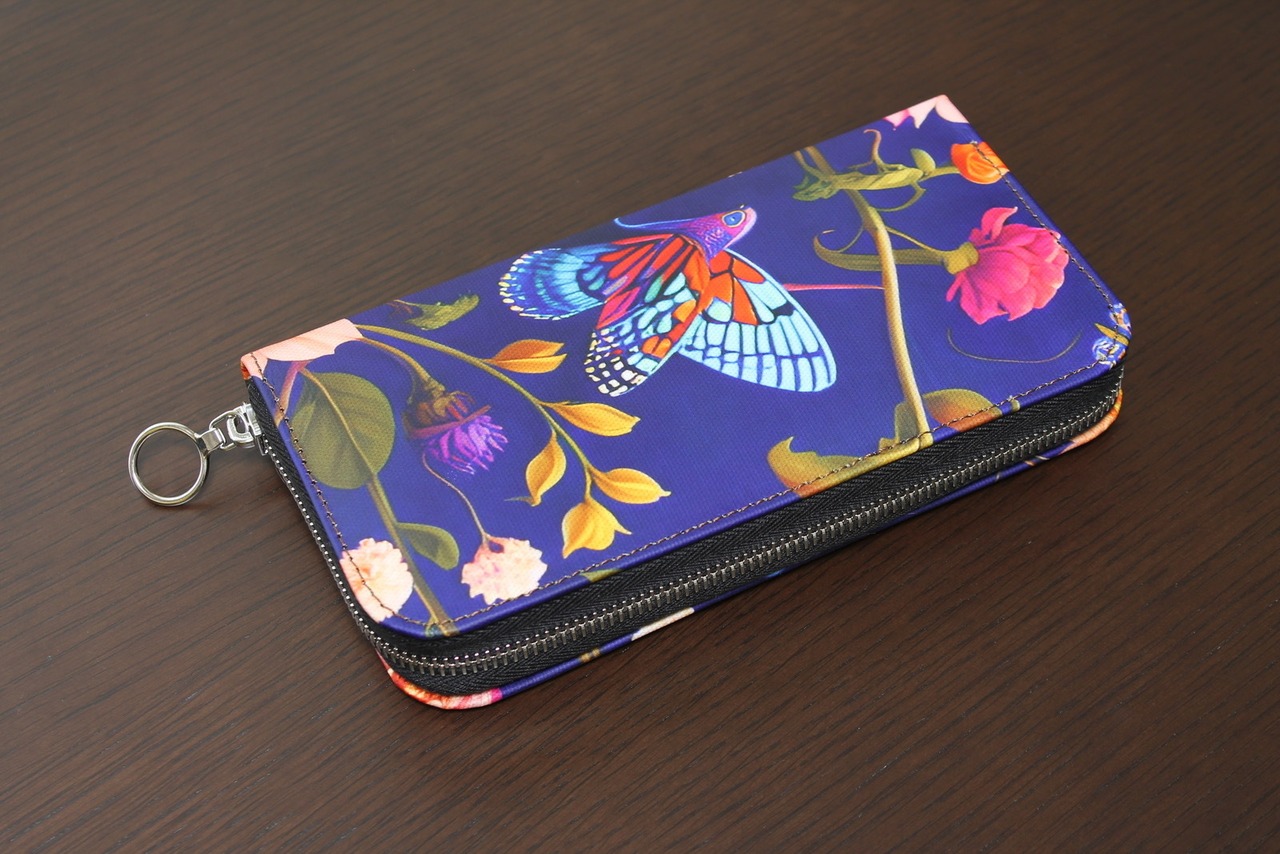 プリント後、バックデザイナーが作成したパターンに基づいて、素材を選択されたサイズに裁断します。熟練した裁縫チームが、選択された色の糸を使用して引き手付ファスナーを取り付けて財布を仕上げます。