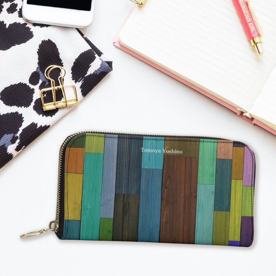 カラフルで色鮮やかな木目調 長財布ポーチ 本革