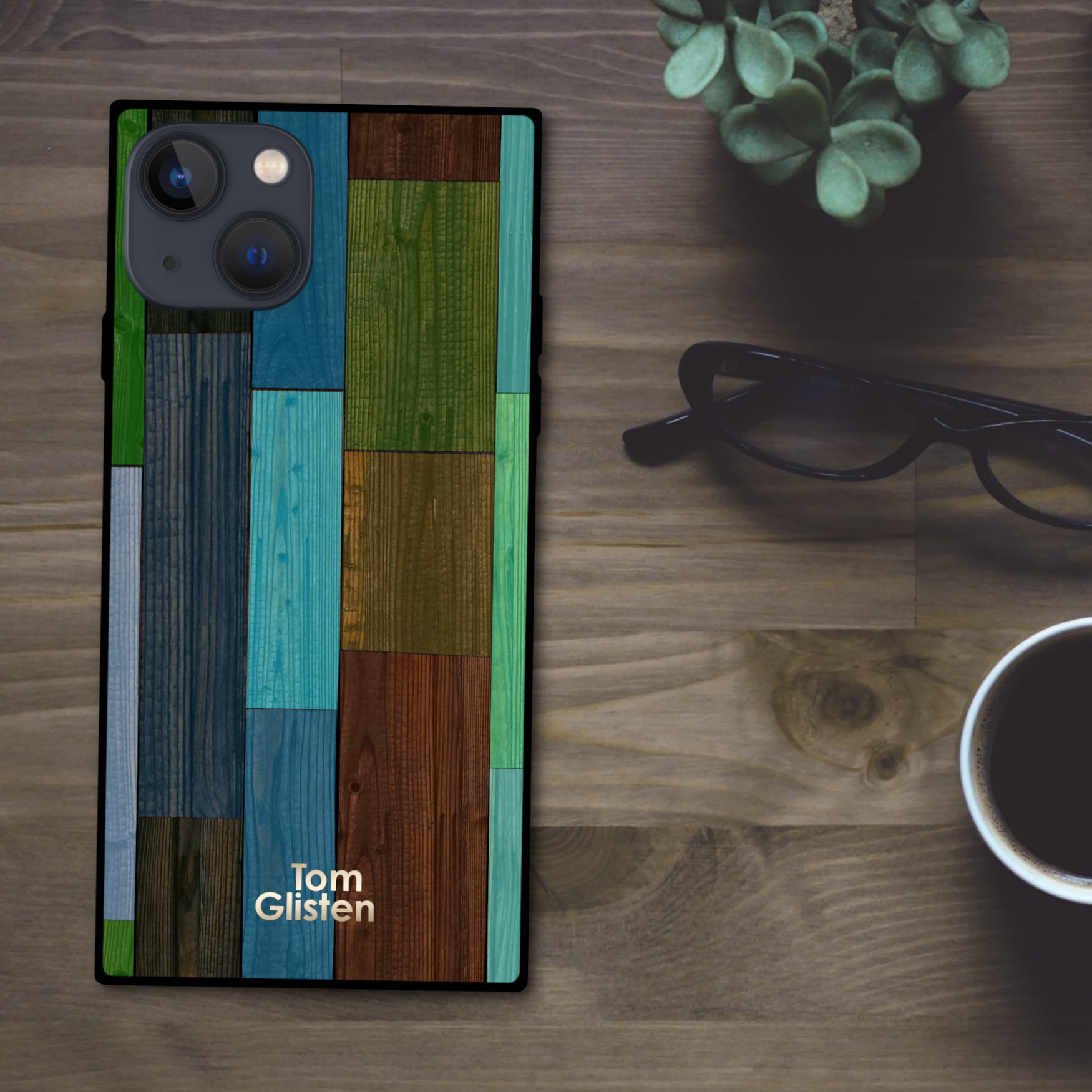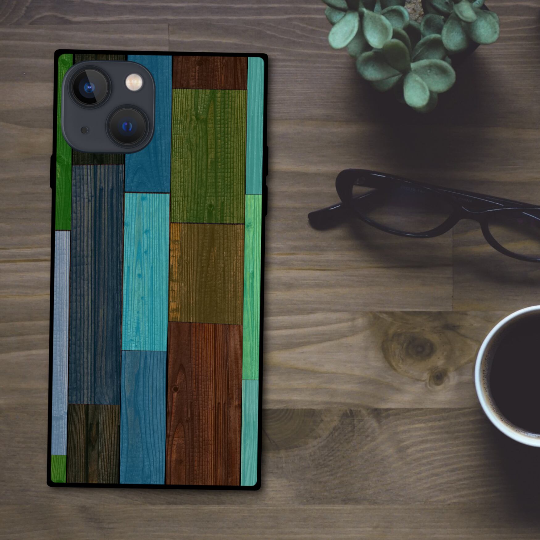 カラフルで色鮮やかな木目調 スクエア型スマホケース【強化ガラス仕上げ】