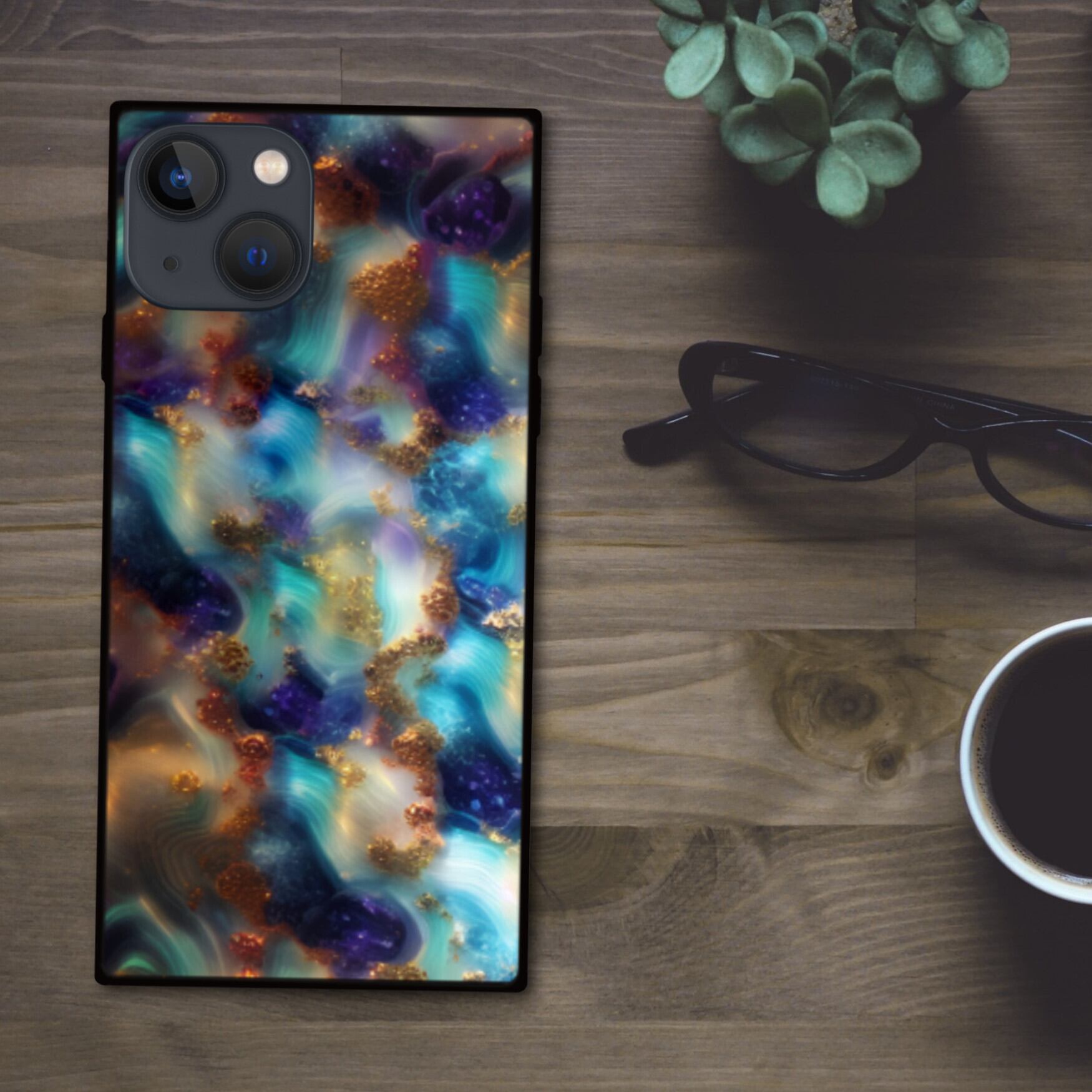 色鮮やかな金色やブルーに輝く神秘的な宇宙 スクエア型スマホケース【強化ガラス仕上げ】