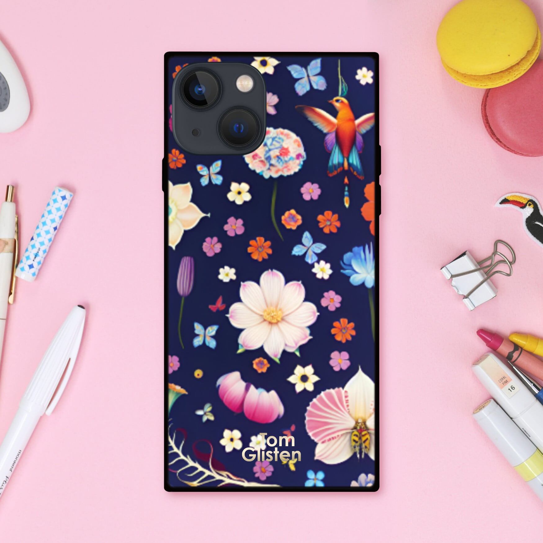 北欧のカラフルで色鮮やかな花柄に飛び交う神秘的な蝶や鳥 スクエア型スマホケース【強化ガラス仕上げ】