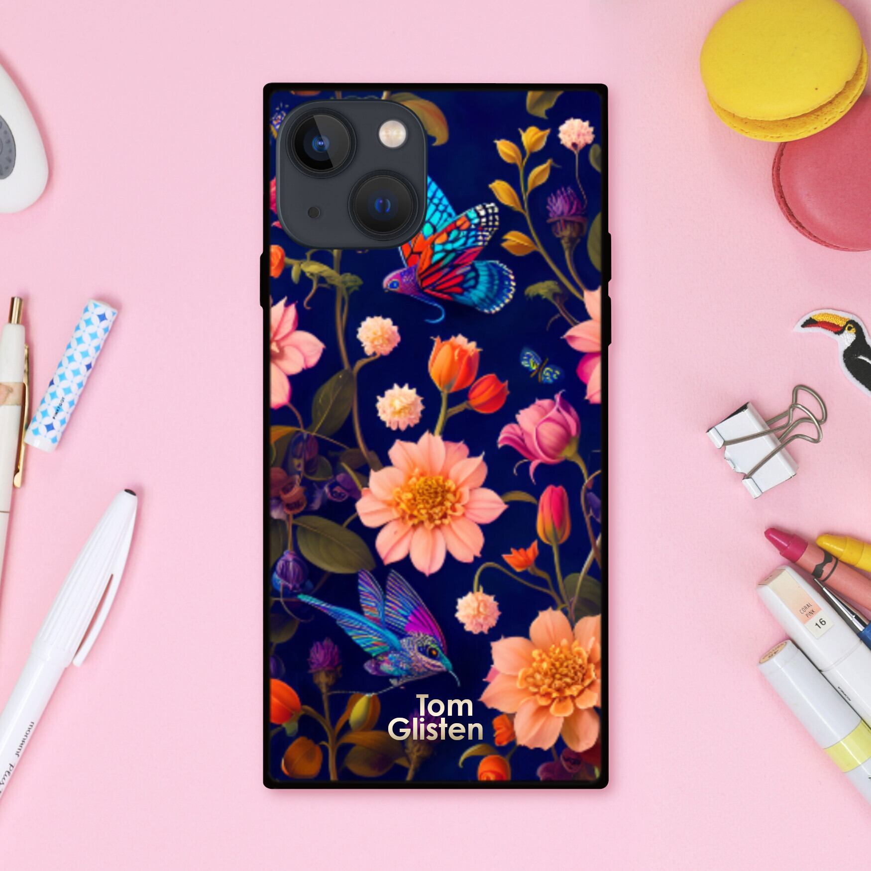 北欧のカラフルで色鮮やかな花柄に飛び交う神秘的な蝶のような鳥 スクエア型スマホケース【強化ガラス仕上げ】
