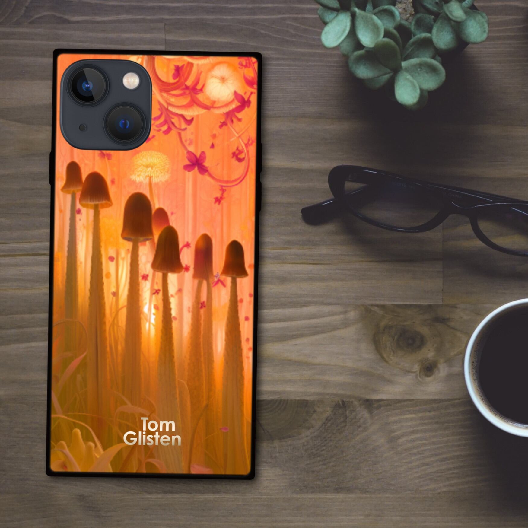リズミカルに並ぶ神秘的なかわいいきのこ スクエア型スマホケース【強化ガラス仕上げ】