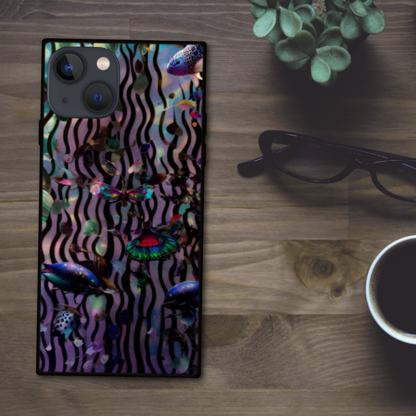 シックで神秘的な孔雀の細胞・縞模様の深海で泳ぐきらびやかで個性的な魚たち スクエア型スマホケース【強化ガラス仕上げ】