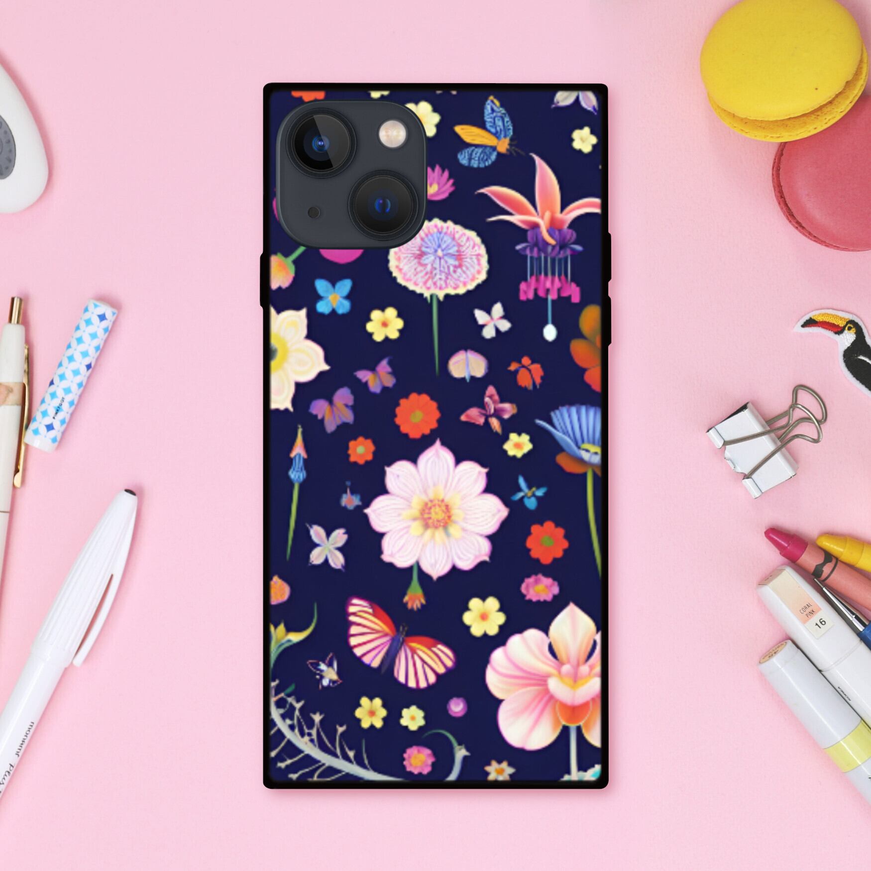 北欧のカラフルで色鮮やかな花柄に飛び交う神秘的な蝶 スクエア型スマホケース【強化ガラス仕上げ】