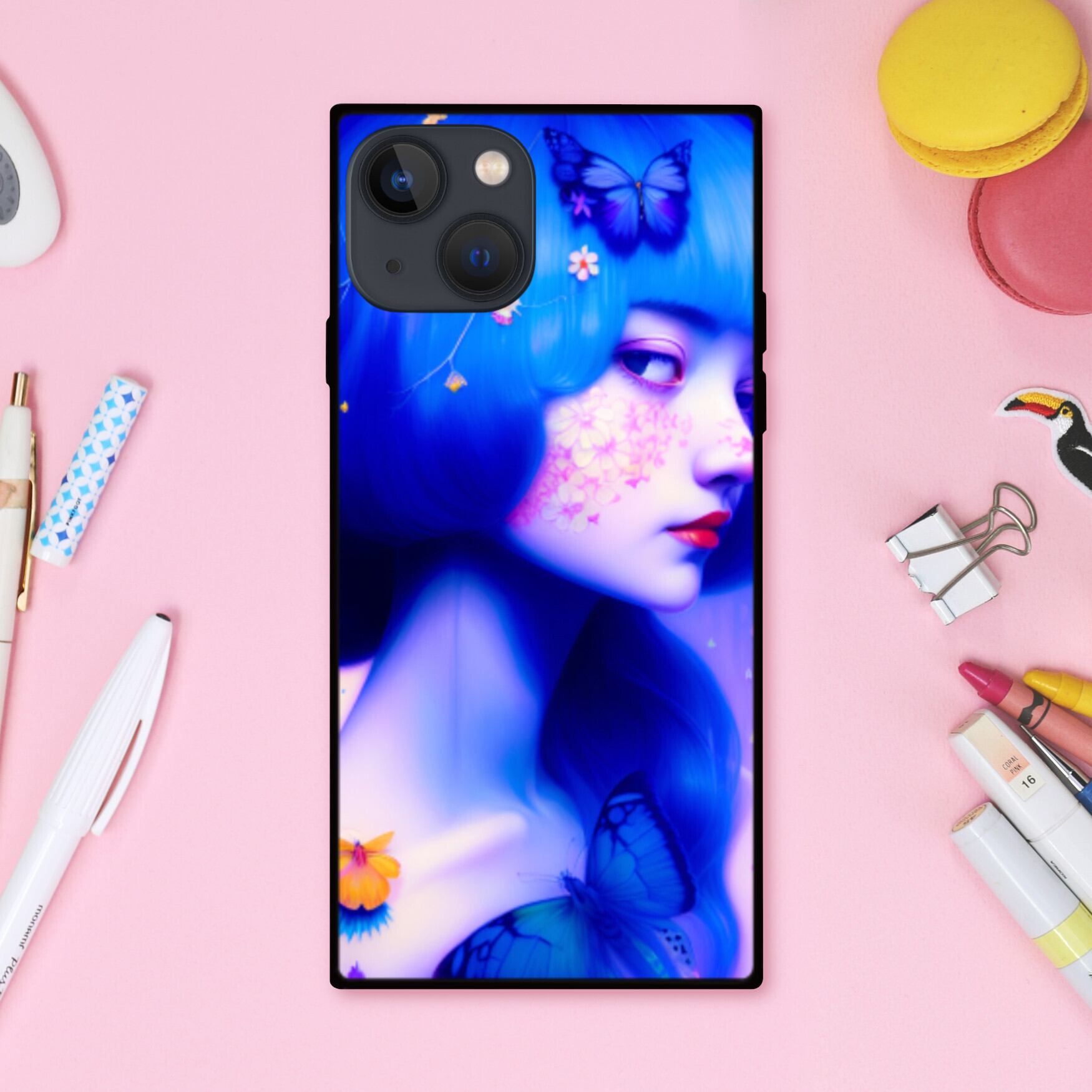 幻想的でゆめかわいいぱっつんの女の子と蝶 スクエア型スマホケース【強化ガラス仕上げ】