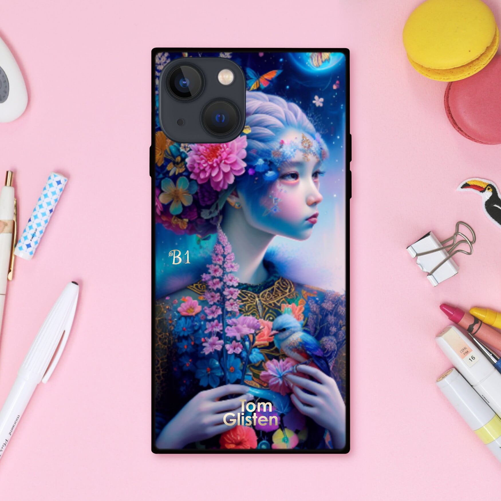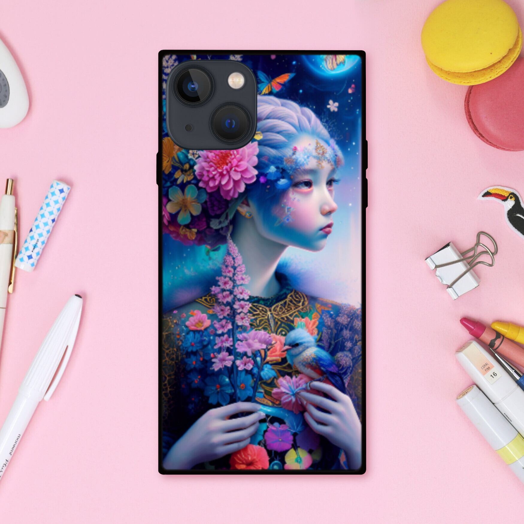 幻想的でシックできらびやかなゆめかわいい女の子と鳥や蝶や花 スクエア型スマホケース【強化ガラス仕上げ】