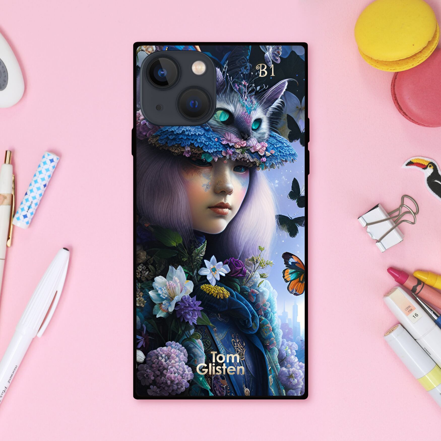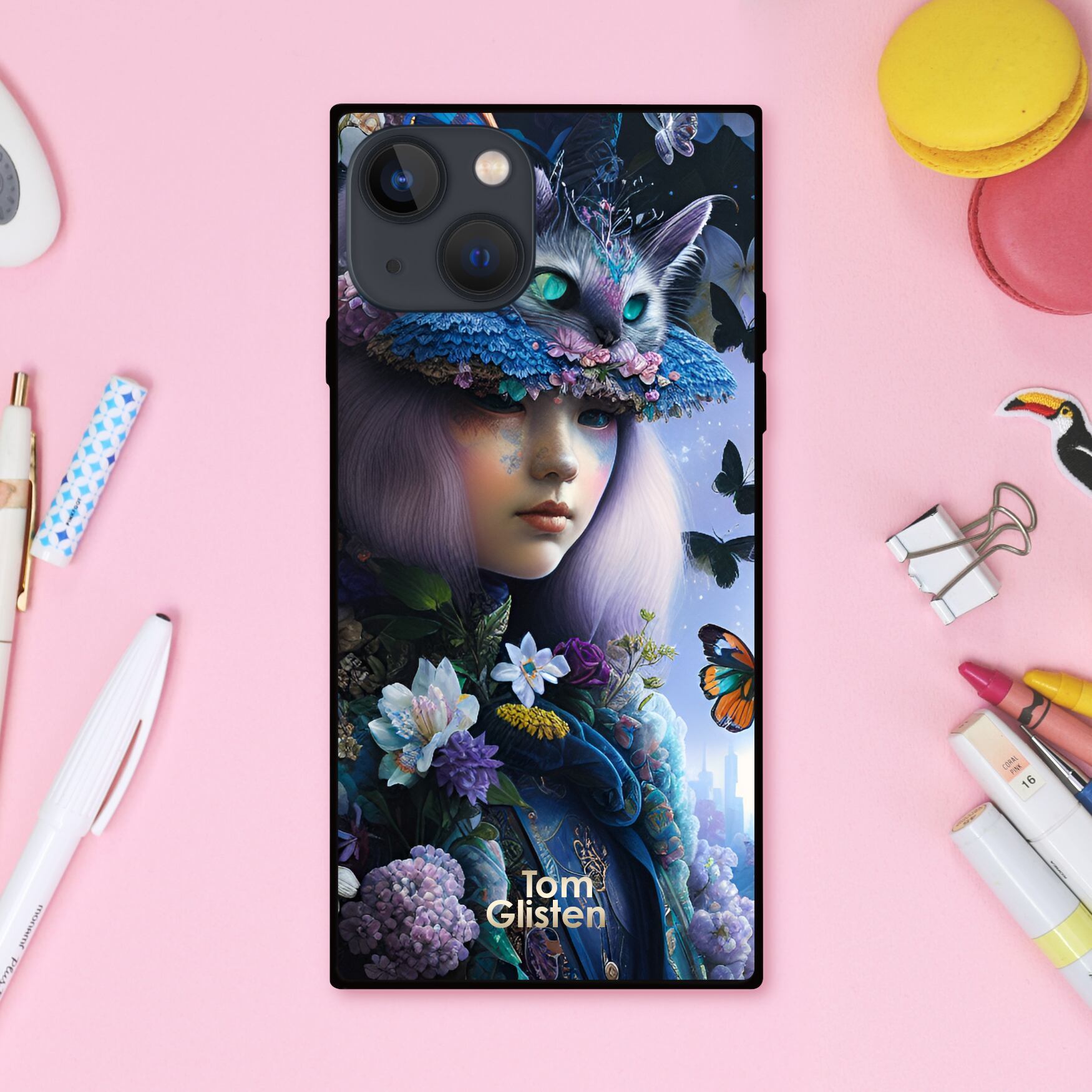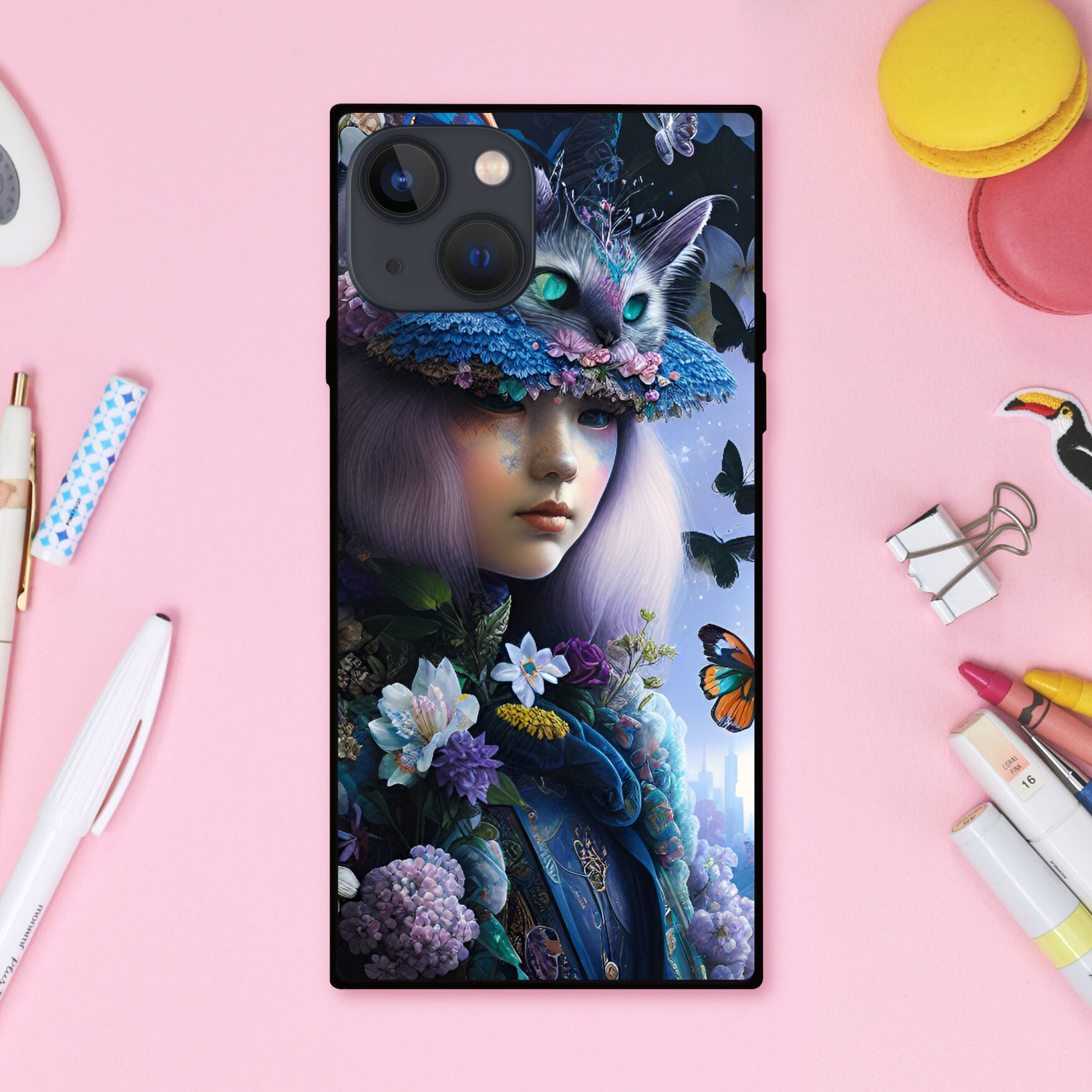 幻想的でシックできらびやかな猫の帽子がゆめかわいい魔女と蝶や花 スクエア型スマホケース【強化ガラス仕上げ】
