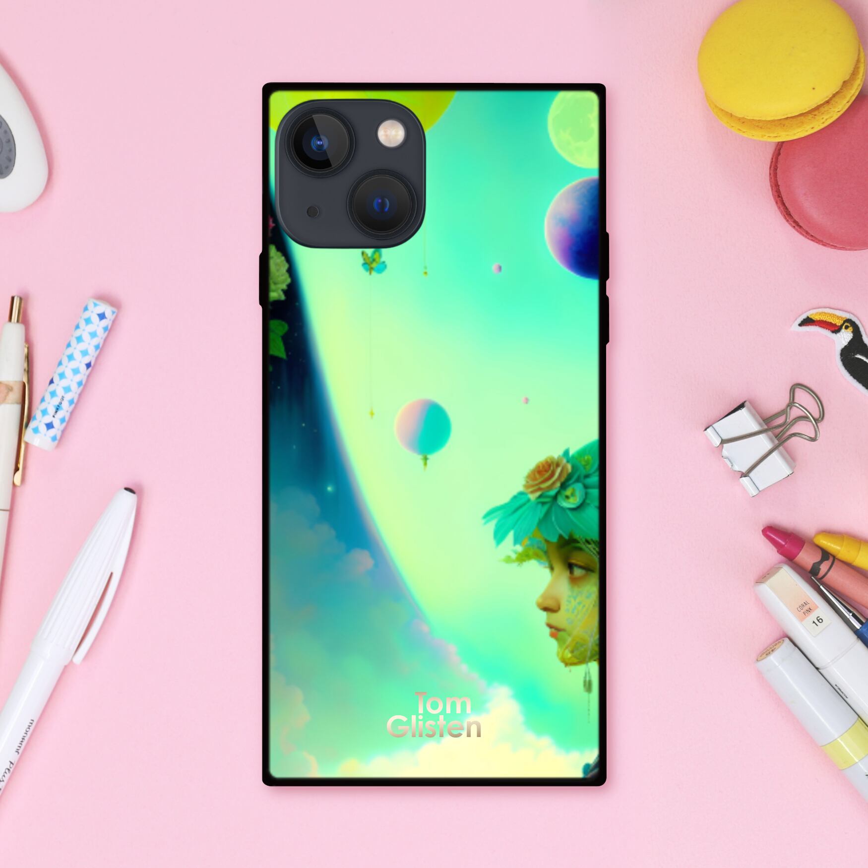 自然とメルヘンチックでゆめかわいい緑色の空と宇宙と女の子 スクエア型スマホケース【強化ガラス仕上げ】