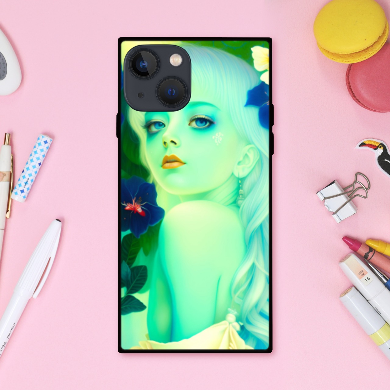 自然とメルヘンチックでゆめかわいい緑色の花と魔女 スクエア型スマホケース【強化ガラス仕上げ】