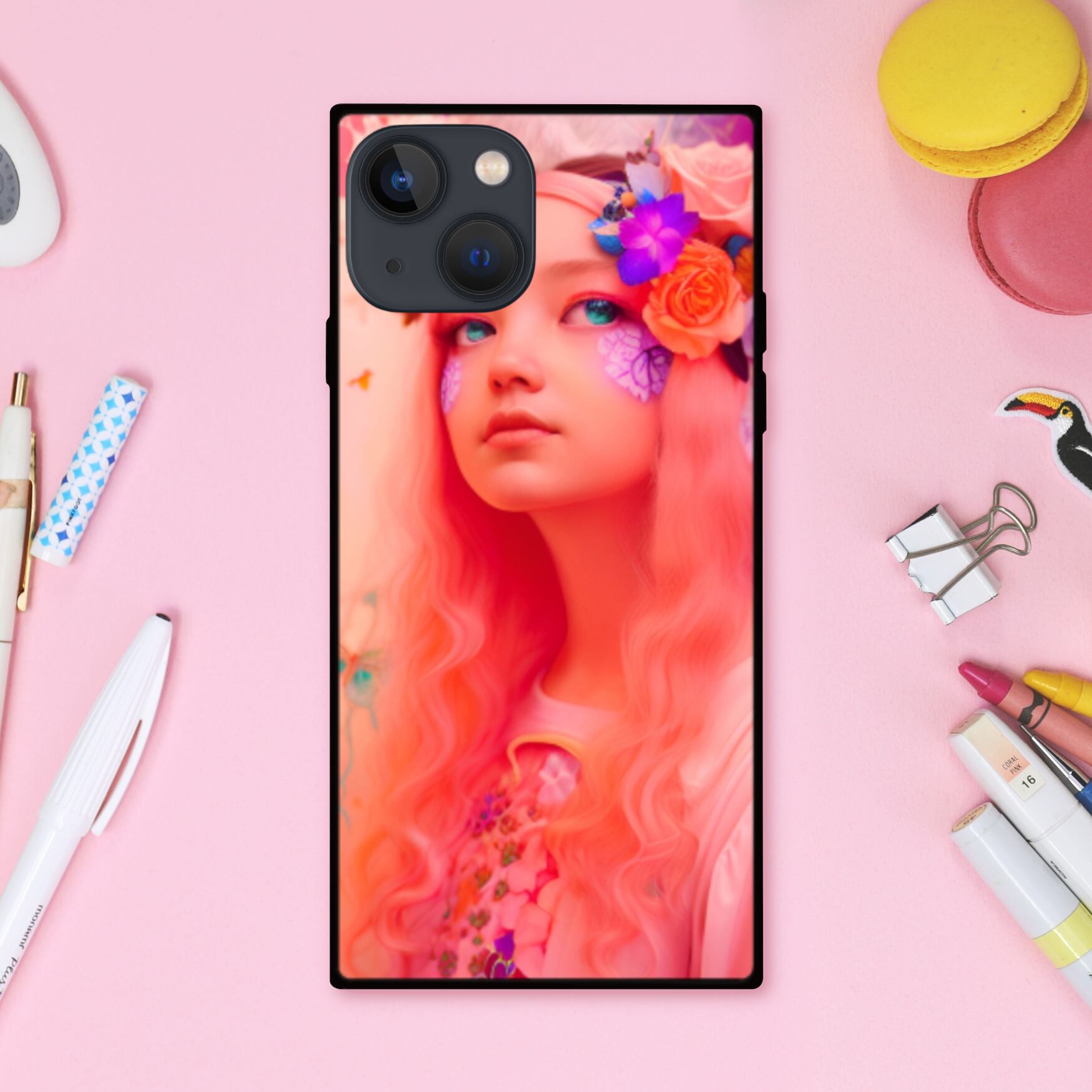 ゆめかわいいコーラルピンクでメルヘンチックな女の子と花 スクエア型スマホケース【強化ガラス仕上げ】