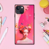 ゆめかわいいコーラルピンクでメルヘンチックな女の子と花や蝶 スクエア型スマホケース【強化ガラス仕上げ】