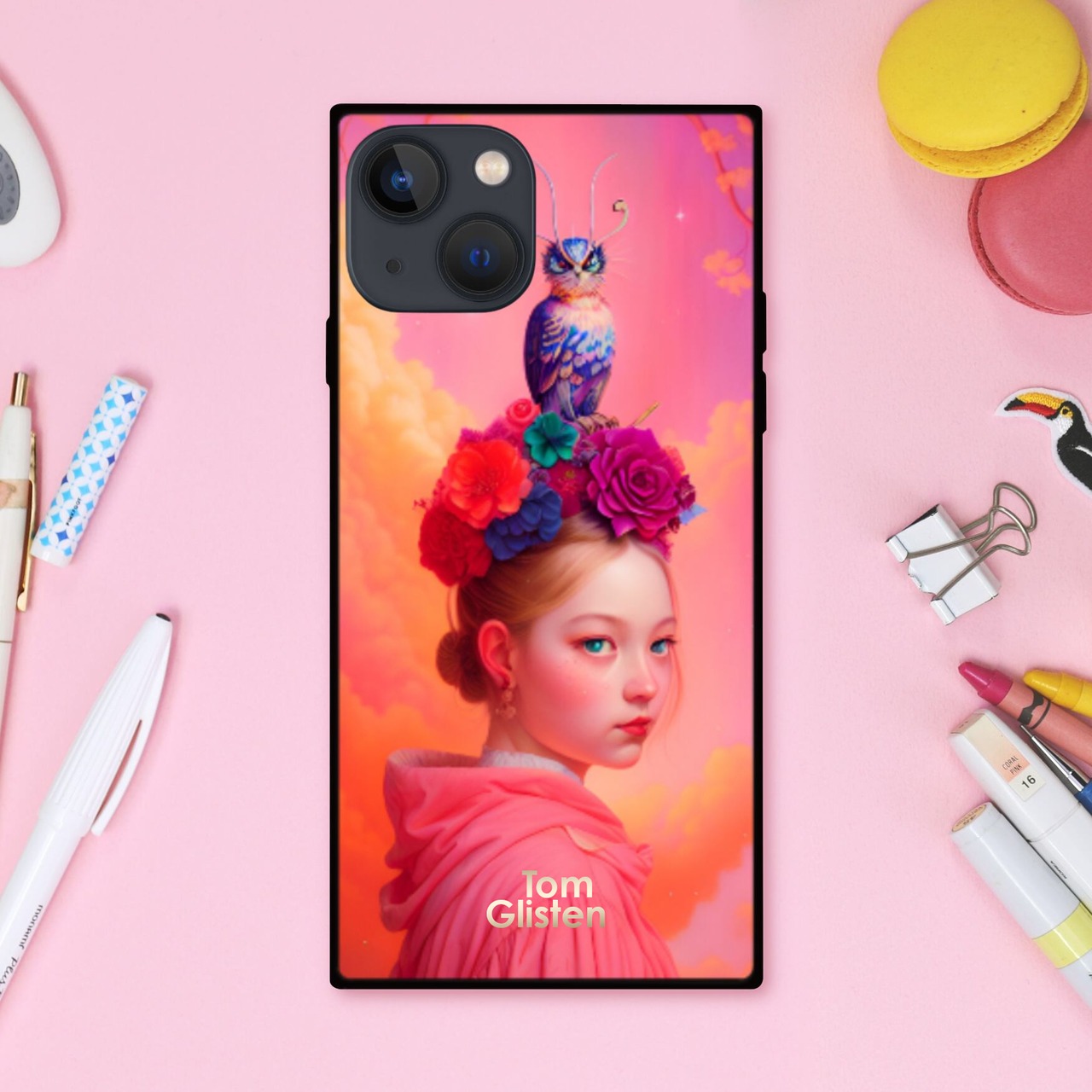 ゆめかわいいコーラルピンクでメルヘンチックな女の子と花やフクロウ スクエア型スマホケース【強化ガラス仕上げ】iPhone15 対応!