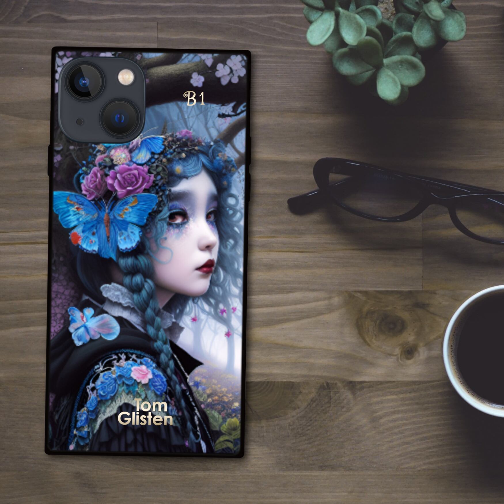 ダークなゴシック調で神秘を感じるきらびやかな森の中の魔女と花や蝶 スクエア型スマホケース【強化ガラス仕上げ】