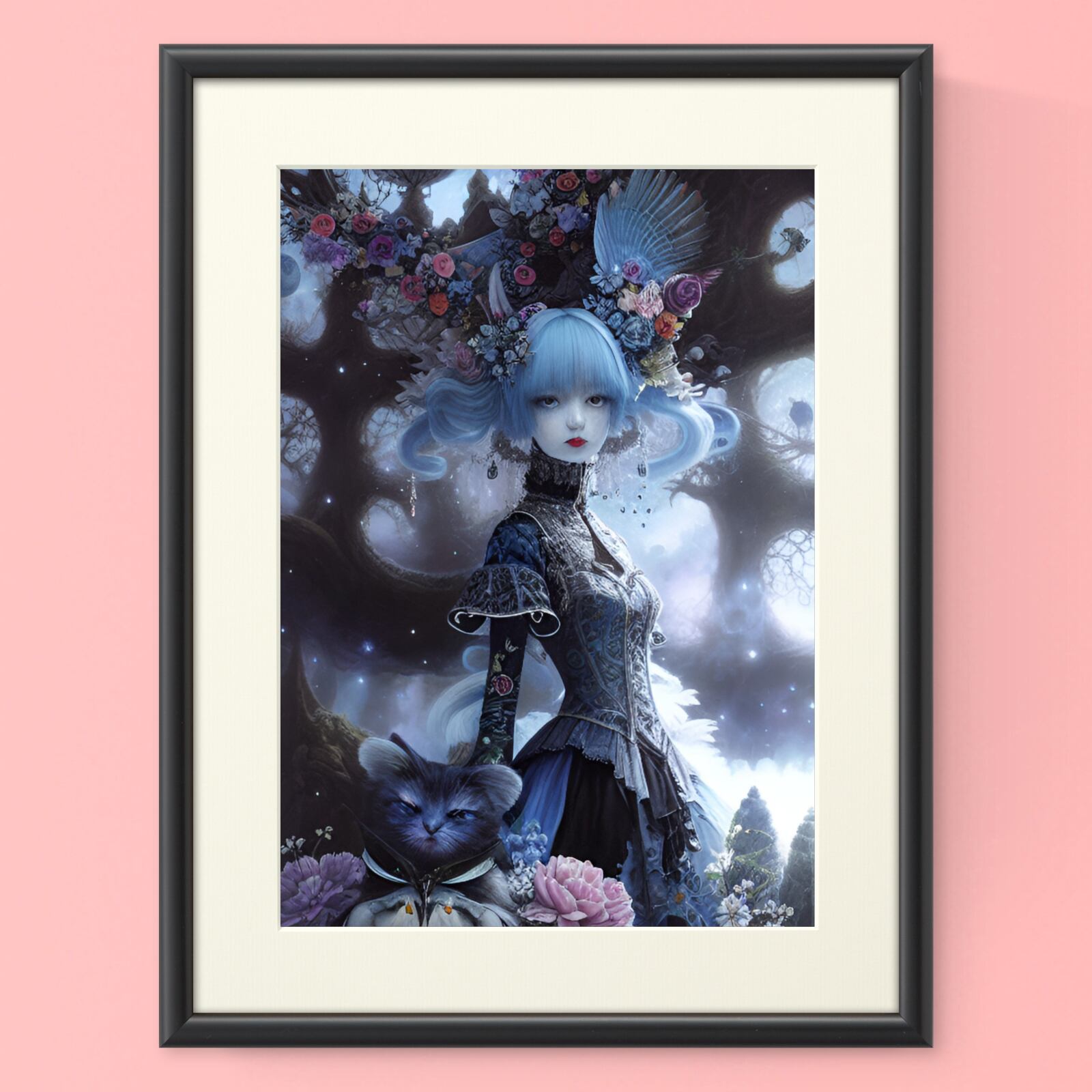 パステルカラーの青い髪がゆめかわいい森の中の魔女と動物や花が非日常の世界へ導きます