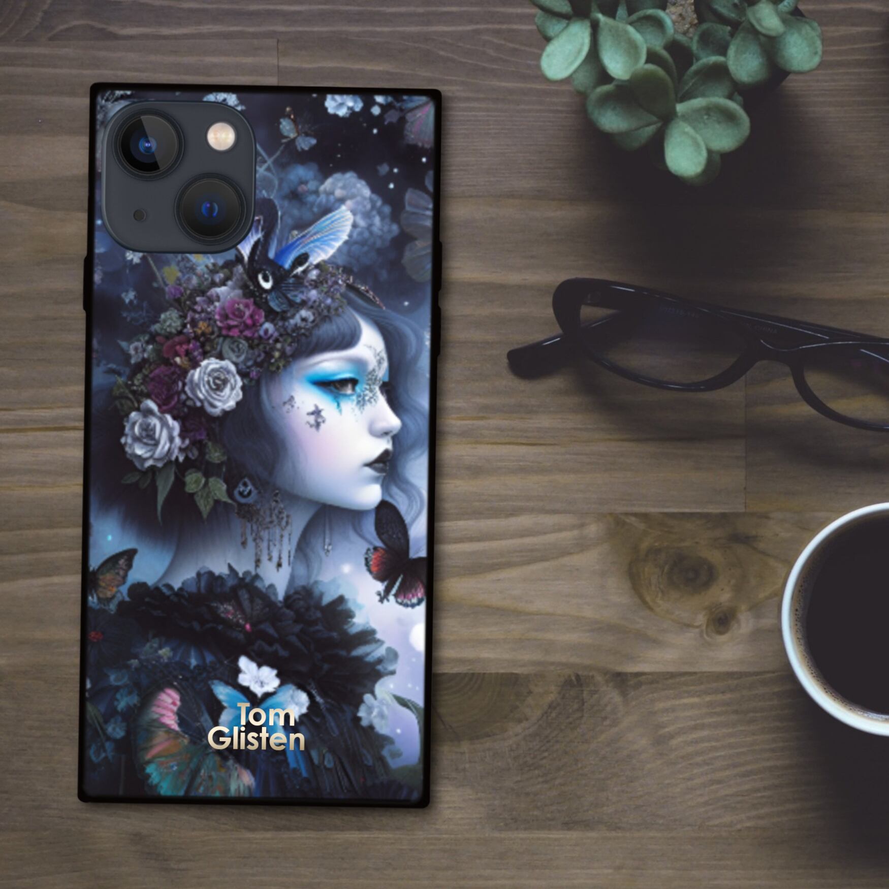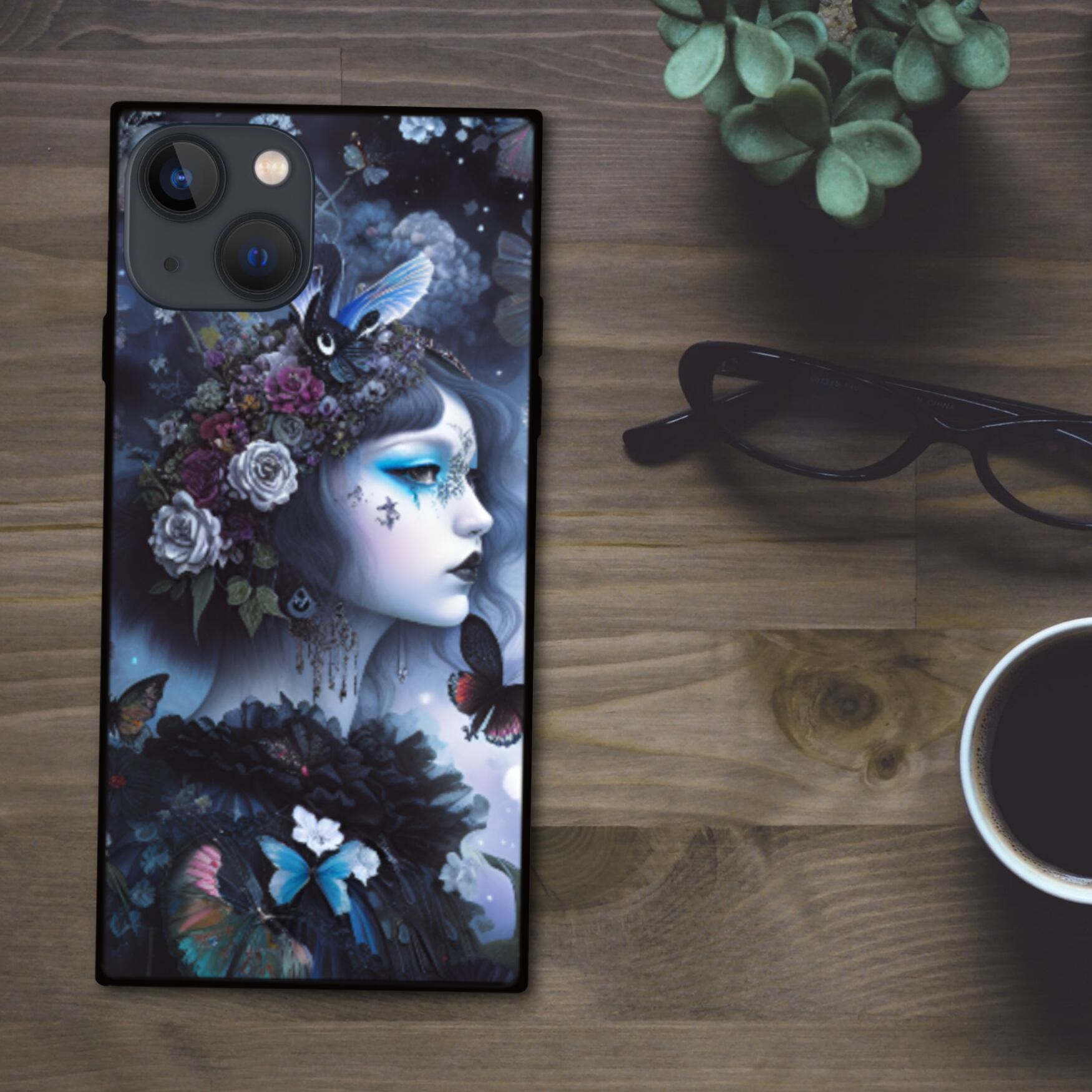 ダークなゴシック調の雰囲気で凛とした魔女と蝶や花 スクエア型スマホケース【強化ガラス仕上げ】