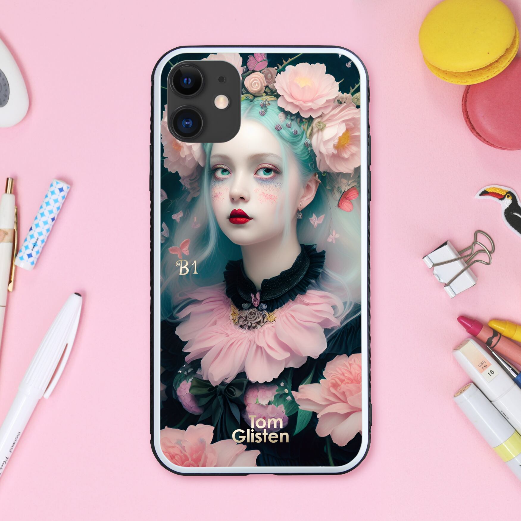 ゴシック調の服とパステルグリーンの髪と花や蝶がゆめかわいい女の子 スマホケース【強化ガラス仕上げ】