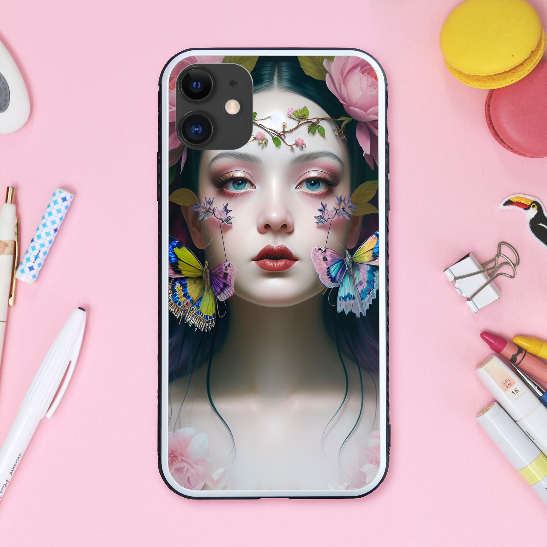 ゆめかわいい女の子と花や色鮮やかできらびやかな蝶 スマホケース【強化ガラス仕上げ】