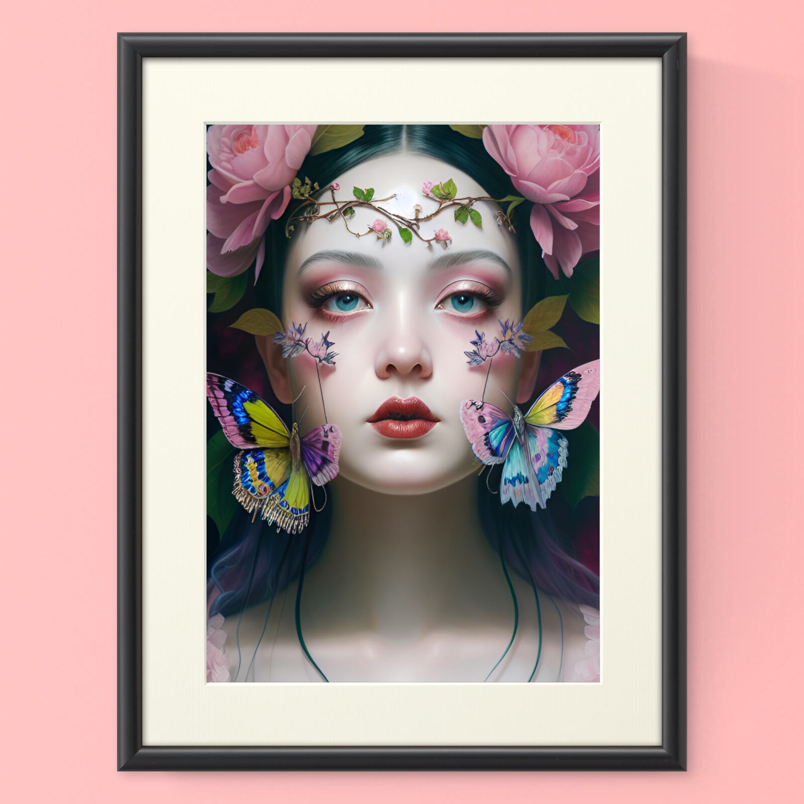 ゆめかわいい女の子と花や色鮮やかで、ゴージャスを感じさせるきらびやかな蝶が神秘的で非日常の世界へ導きます。