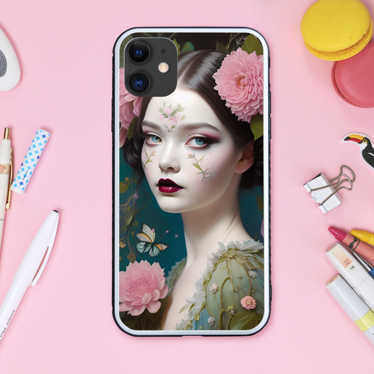 くすみカラーのパステルグリーンの洋服と花がエレガントでゆめかわいい女の子と蝶 スマホケース【強化ガラス仕上げ】