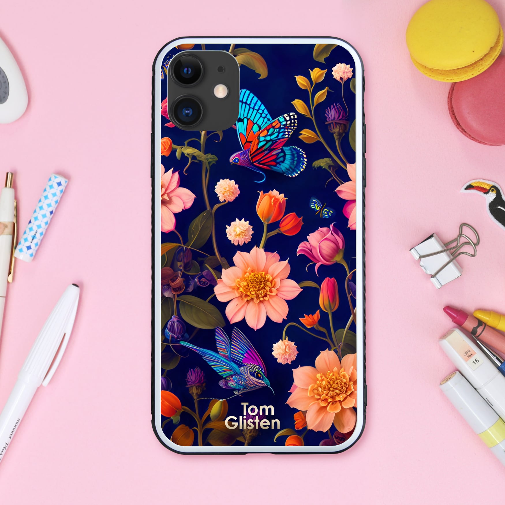 北欧のカラフルで色鮮やかな花柄に飛び交う神秘的な蝶のような鳥 スマホケース【強化ガラス仕上げ】