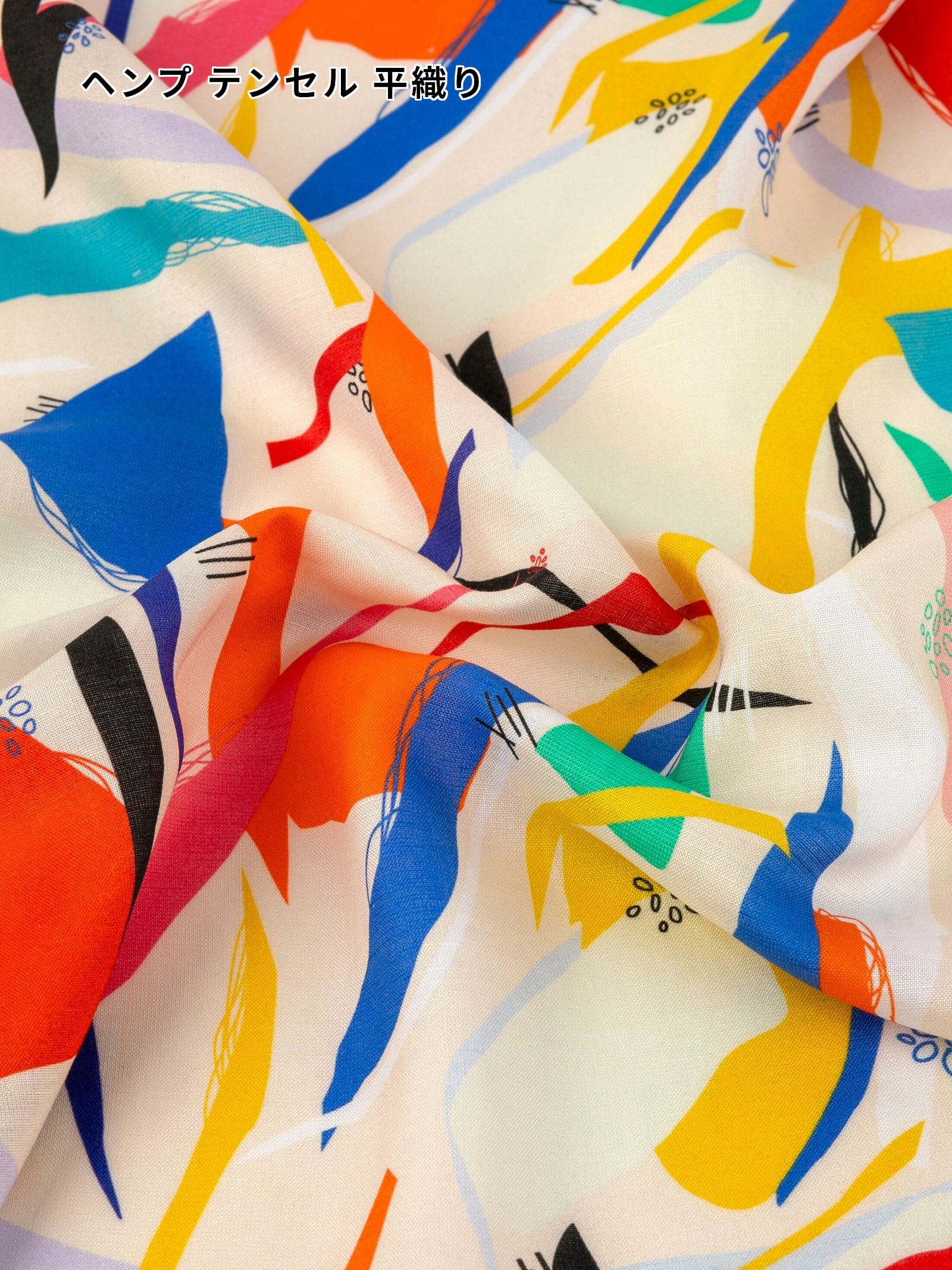 (テンセルの柔らかさを備えた、風通しの軽いヘンプ。ヘンプ繊維をスラブ糸で織り上げた、持続可能な環境に配慮した素材。ヘンプ30%、テンセル70%、反応性インクでプリント。)