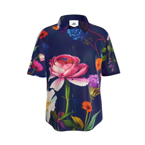 宝石や鉱石のように輝く北欧のカラフルで色鮮やかな花柄や蒼い背景が上品でお洒落 ボタンアップシャツ 半袖