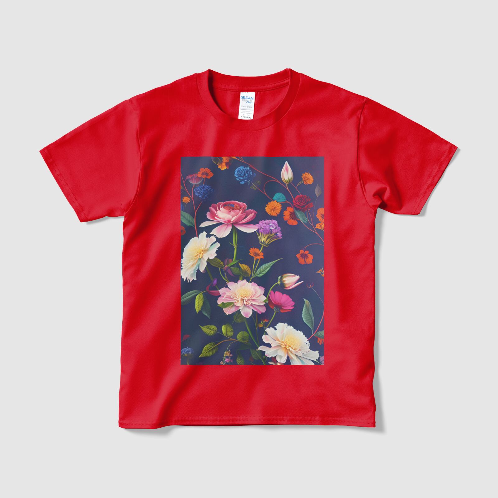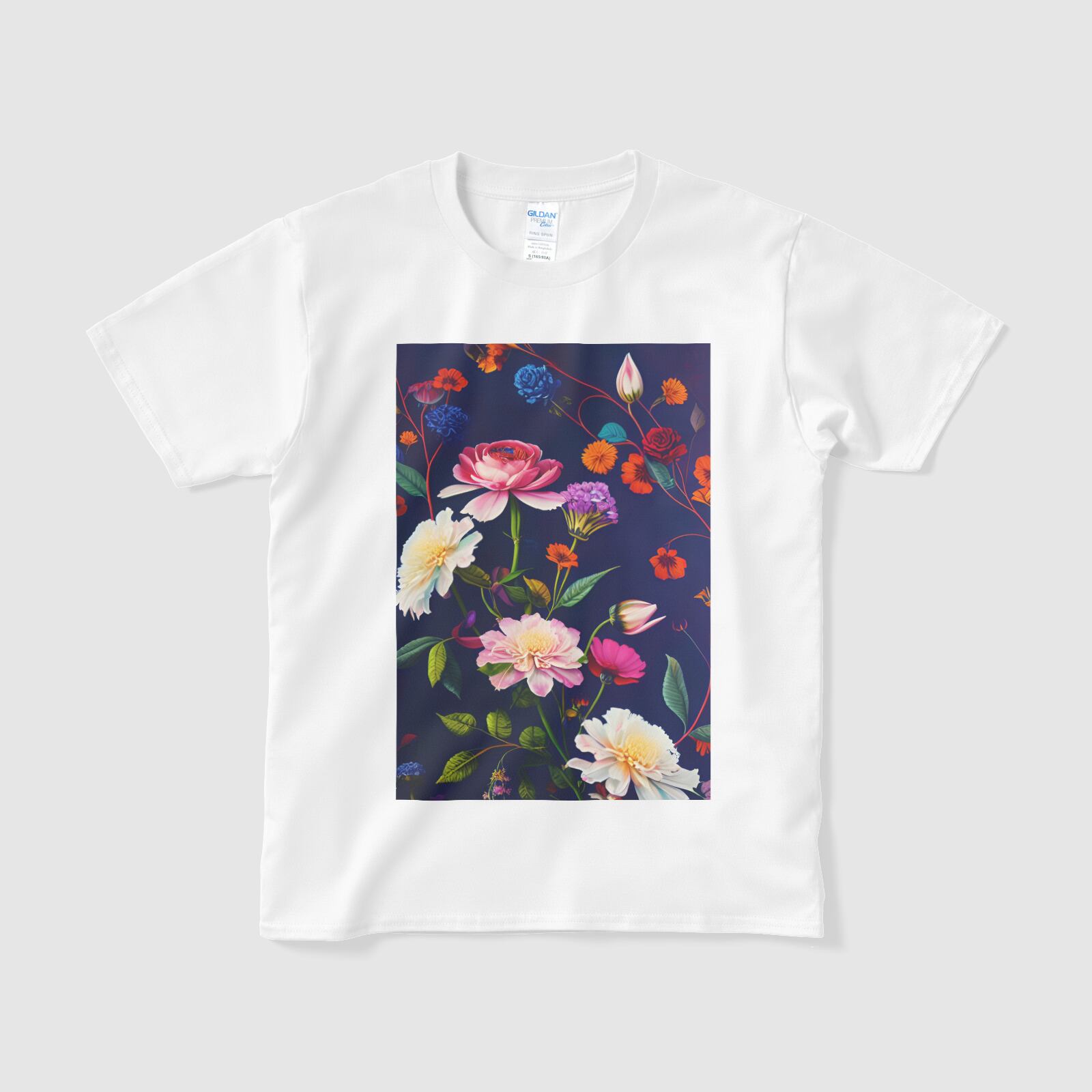 宝石や鉱石のように輝く北欧のカラフルで色鮮やかな花柄や蒼い背景が上品でお洒落 Tシャツ 半袖【4色展開】