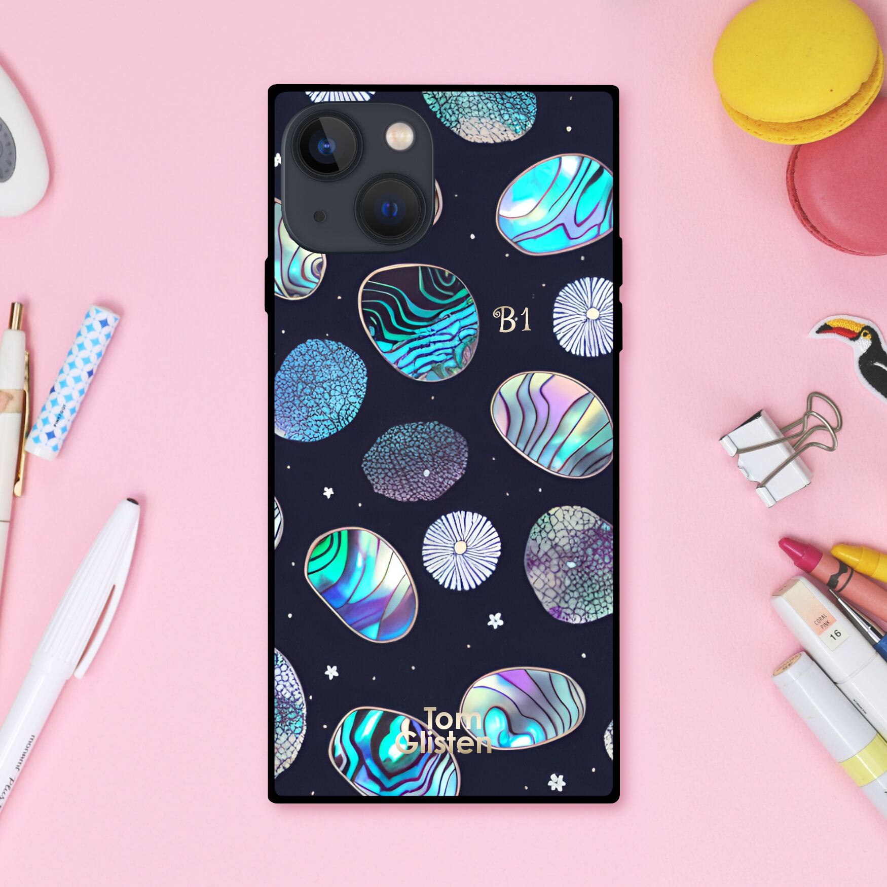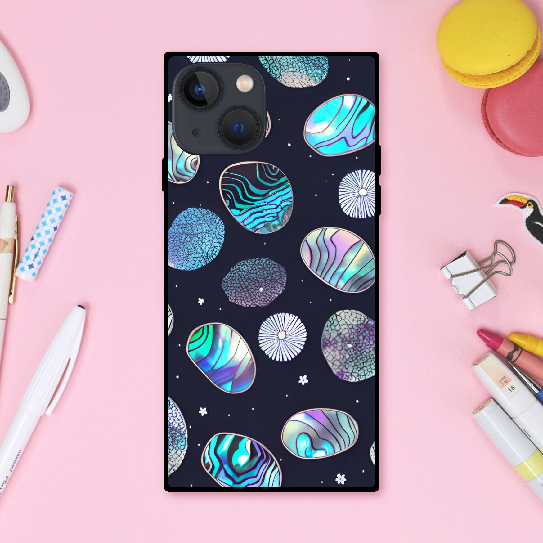丸くゆめかわいいきらびやかなパステルでメルヘンチックなアバロン貝 スクエア型スマホケース【強化ガラス仕上げ】
