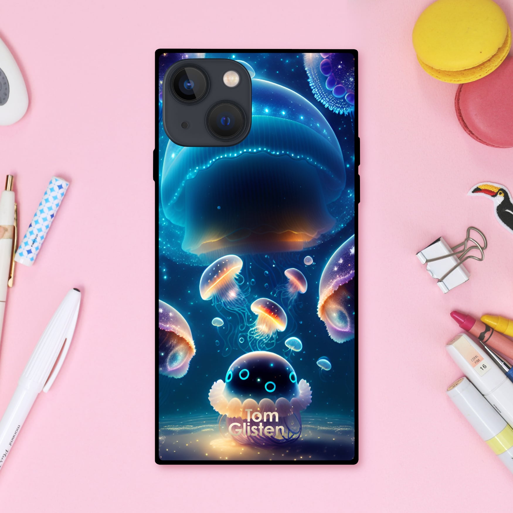 宇宙のような深海で泳ぐ幻想的でゆめかわいいきらびやかなネオン色に光るクラゲ スクエア型スマホケース【強化ガラス仕上げ】