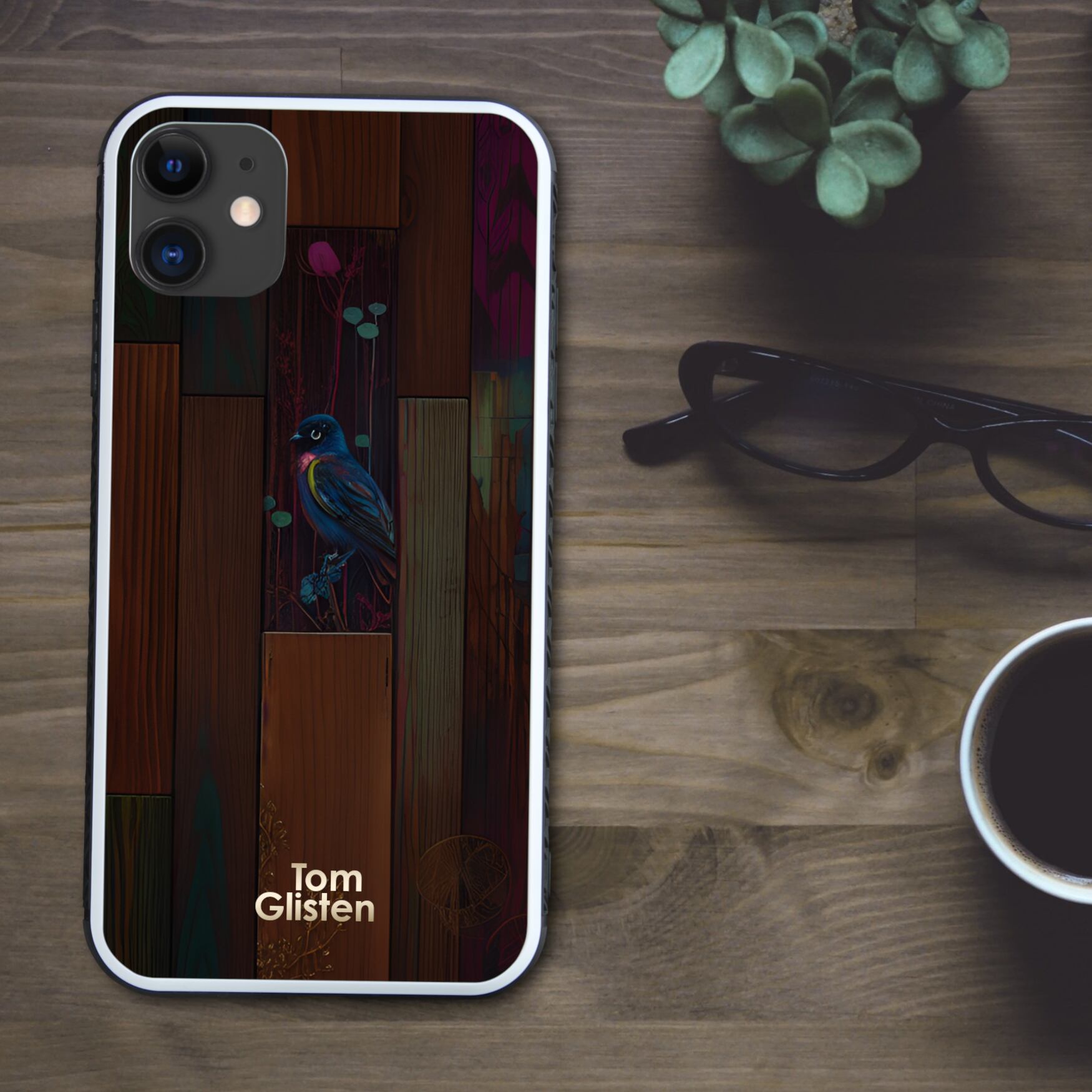 シックでお洒落でアンティークでレトロな雰囲気の木目調と青い鳥 スマホケース【強化ガラス仕上げ】