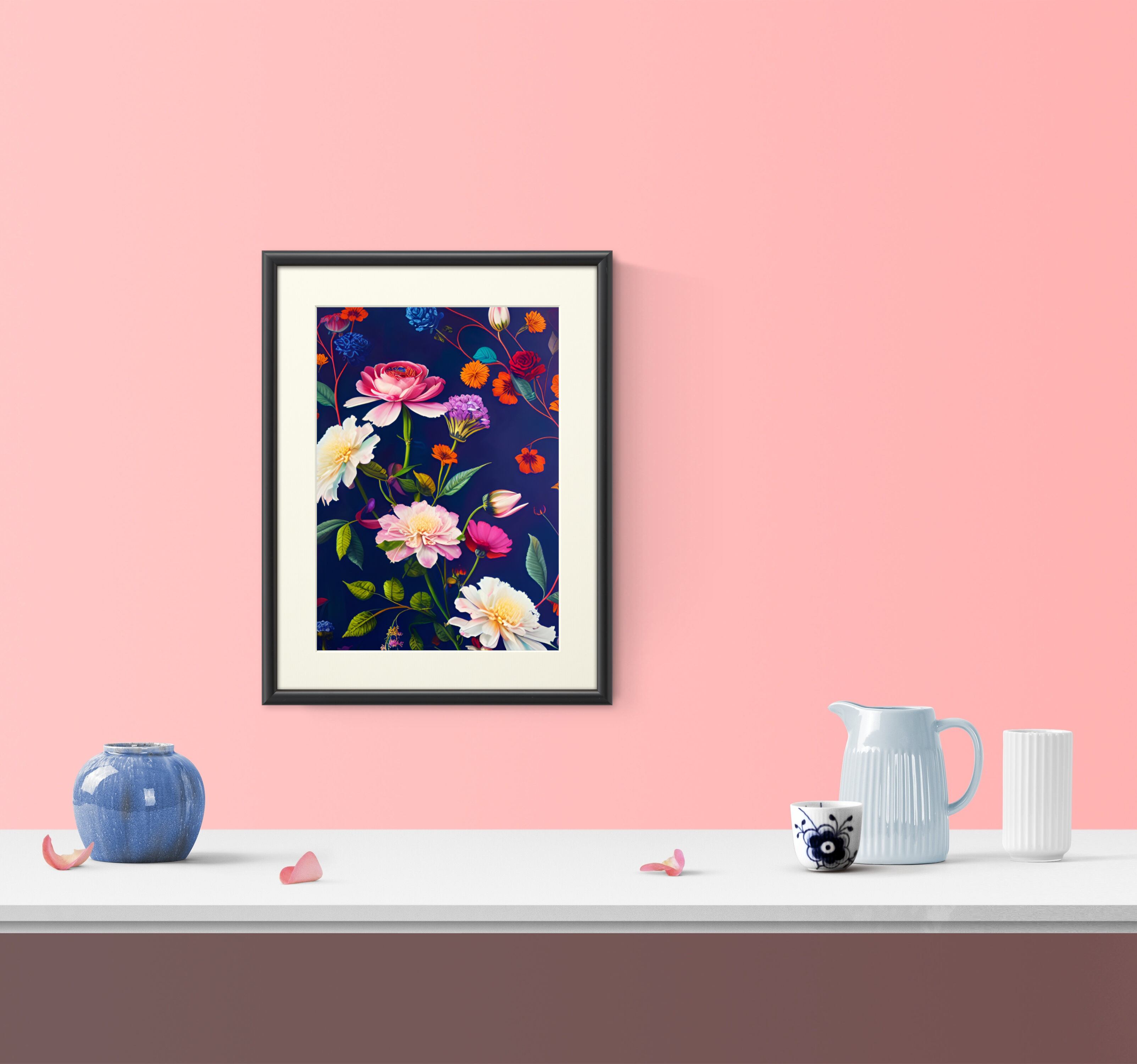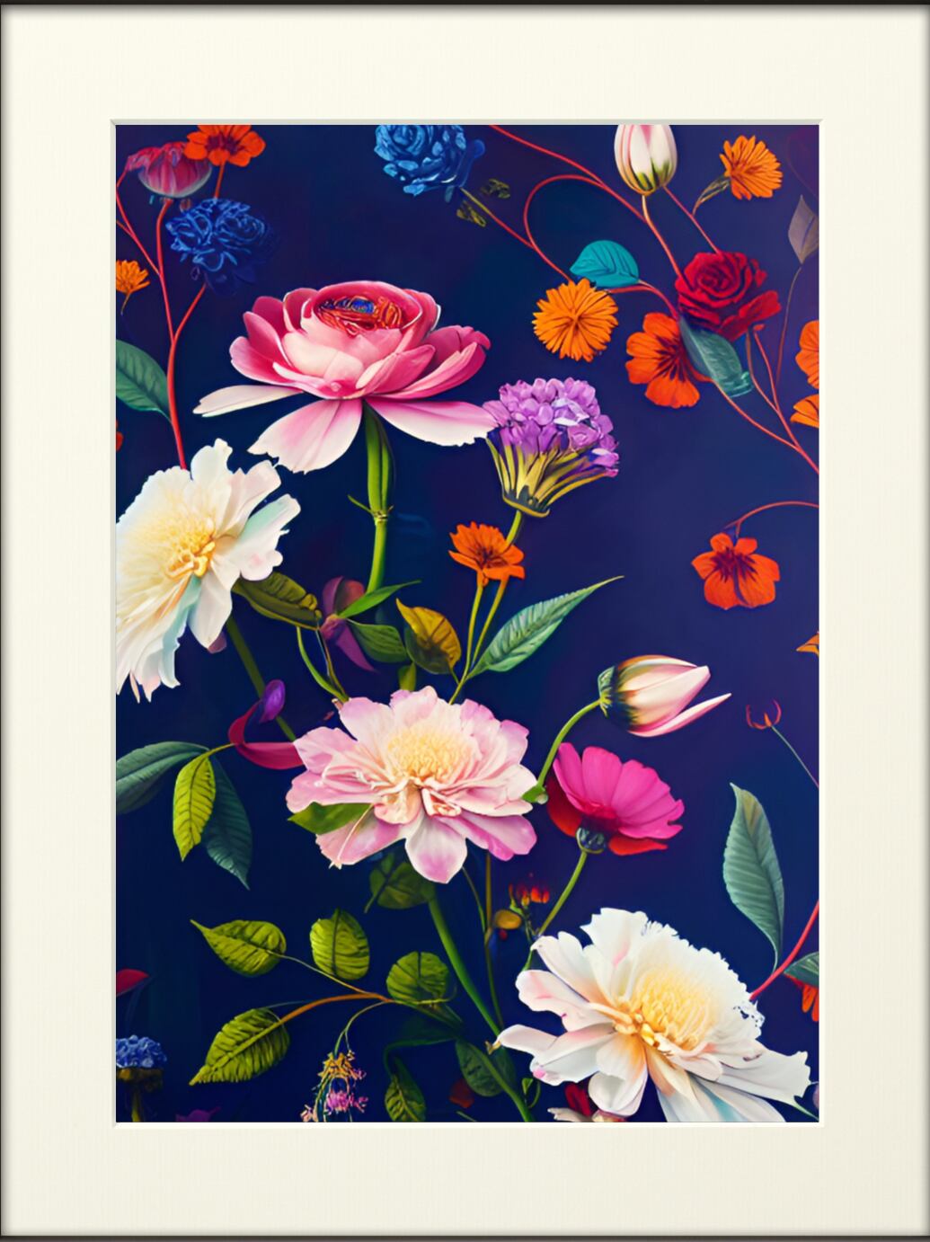 『原画』宝石や鉱石のように輝く北欧のカラフルで色鮮やかな花柄や蒼い背景が上品でお洒落 グラフィック絵画