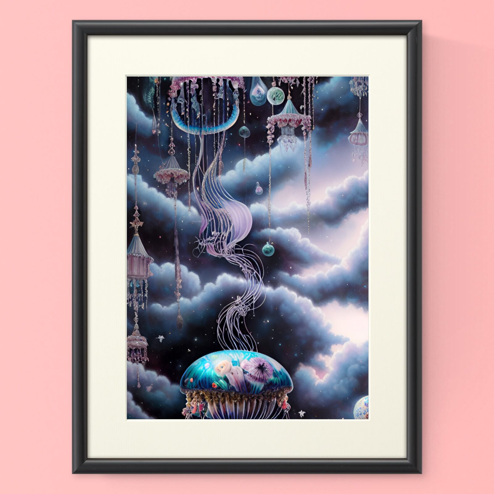 『原画』幻想的でゆめかわいいクラゲときらびやかな飾りや宇宙 グラフィック絵画