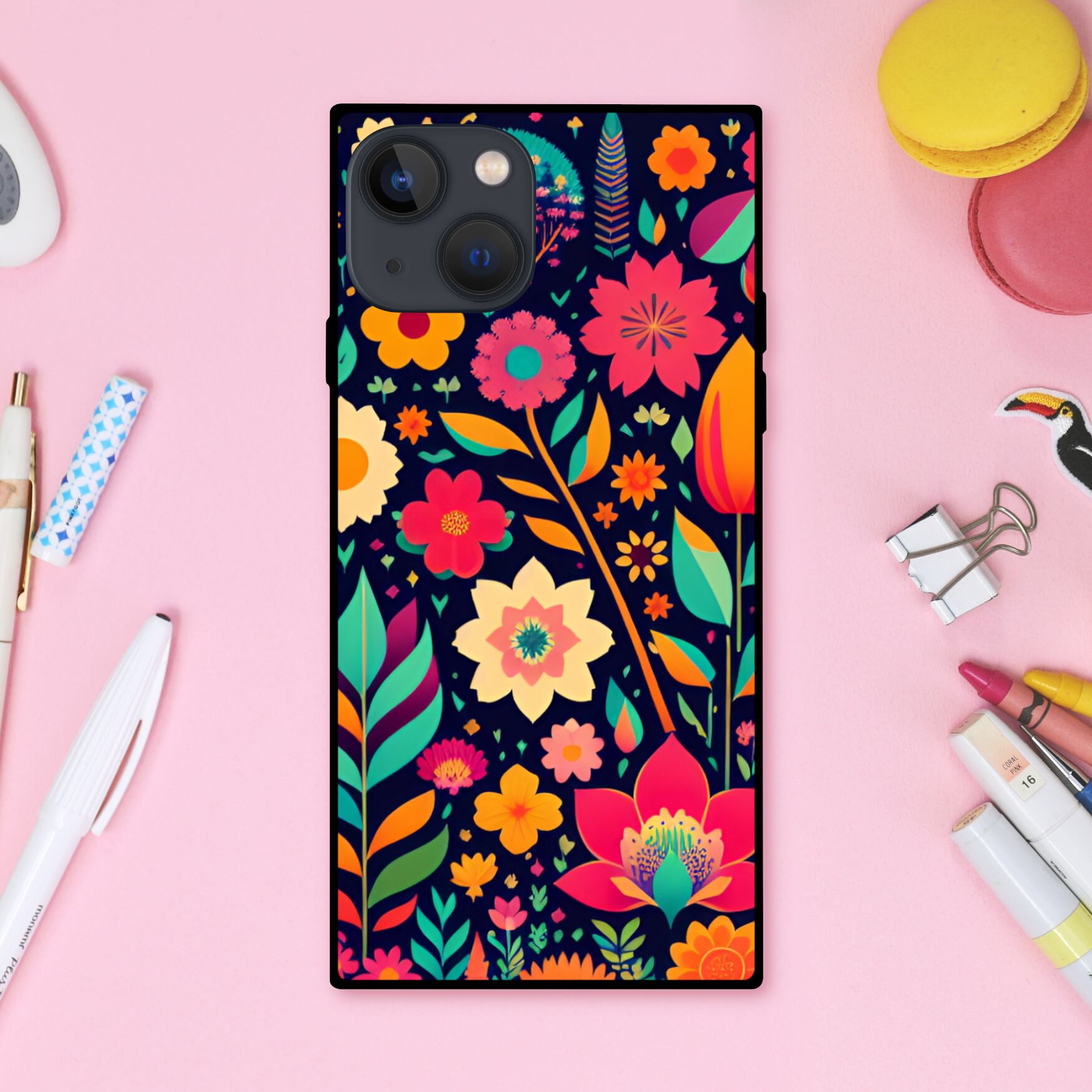 都会的なカラフルで色鮮やかな北欧の自然を感じるボタニカルな花柄 スクエア型スマホケース【強化ガラス仕上げ】