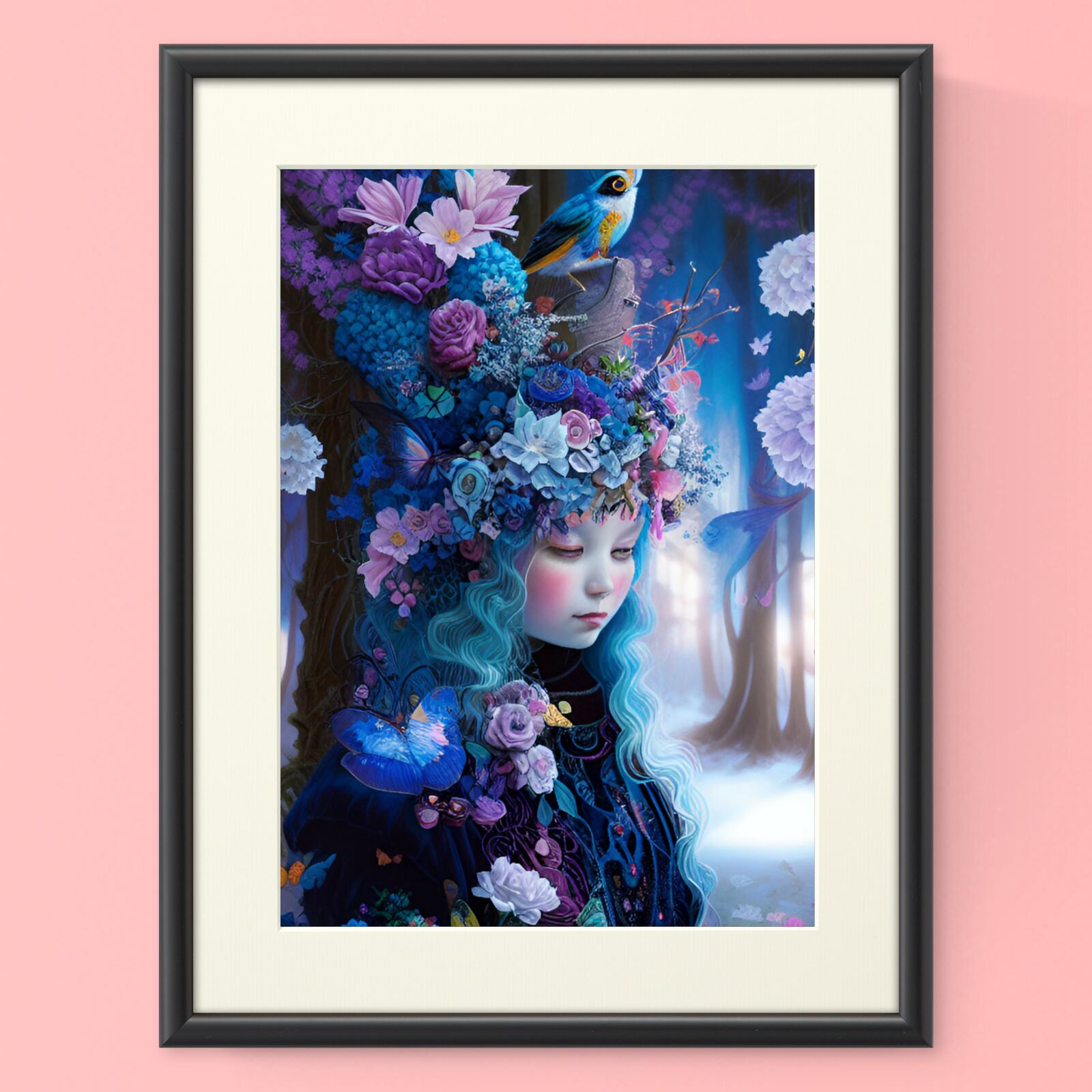 『原画』幻想的でシックできらびやかなゆめかわいい森の中の魔女と鳥や蝶や花 グラフィック絵画