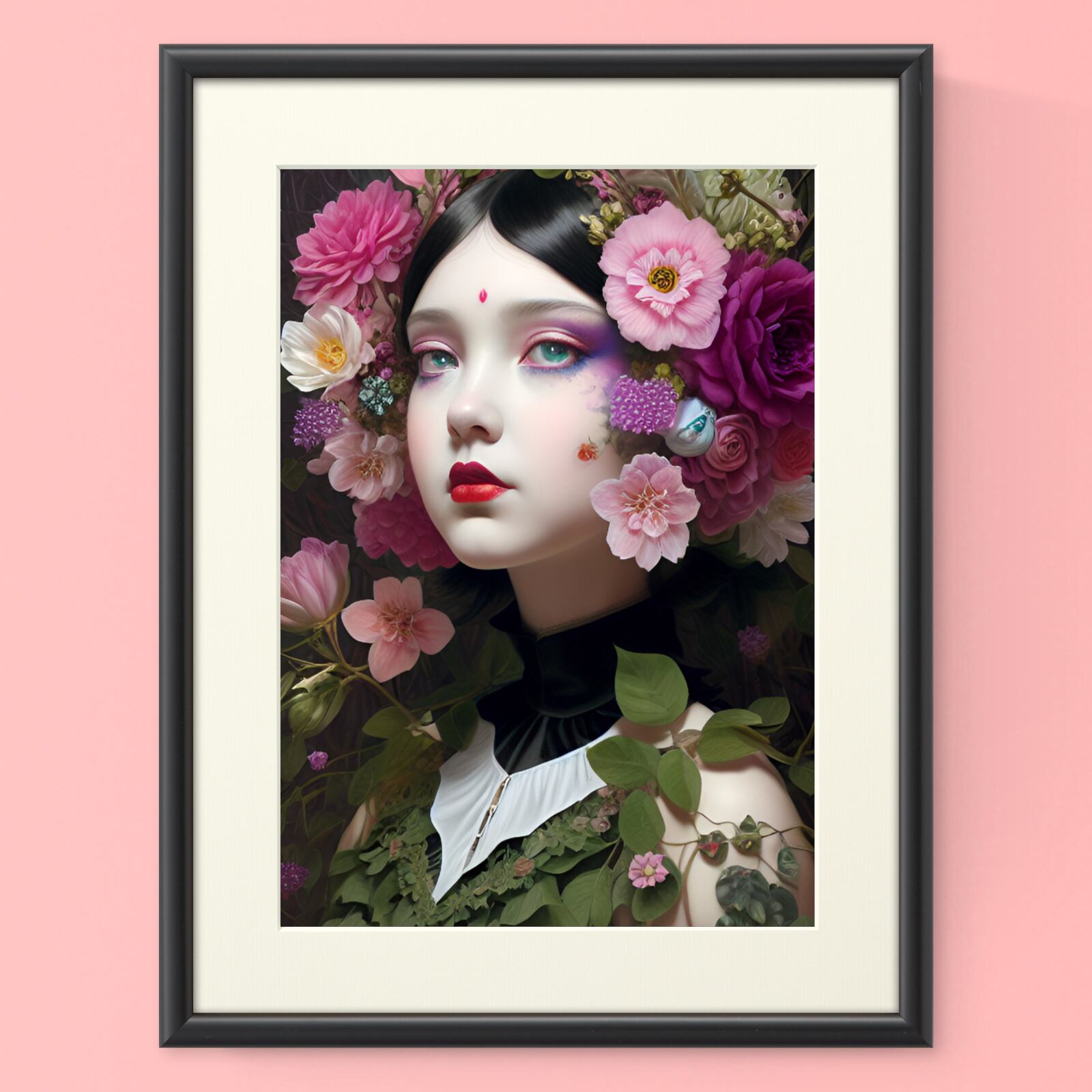 『原画』花と植物のきらびやかな洋服と髪飾りがお洒落なゆめかわいい女の子 グラフィック絵画