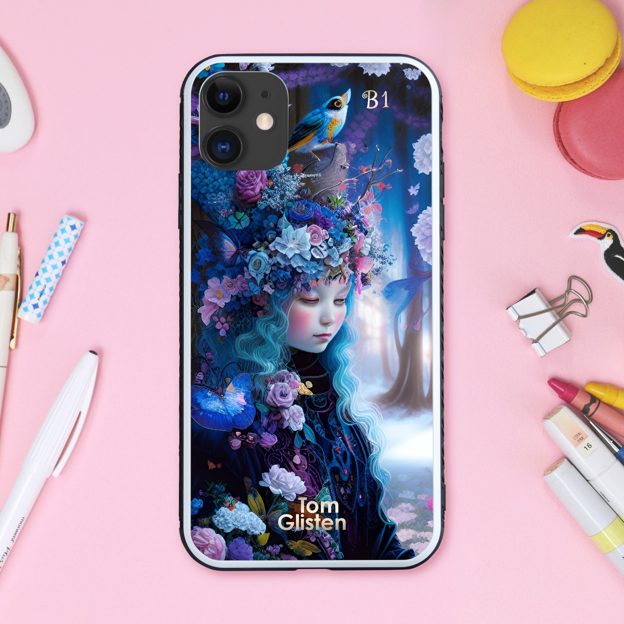 幻想的でシックできらびやかなゆめかわいい森の中の魔女と鳥や蝶や花 スマホケース【強化ガラス仕上げ】