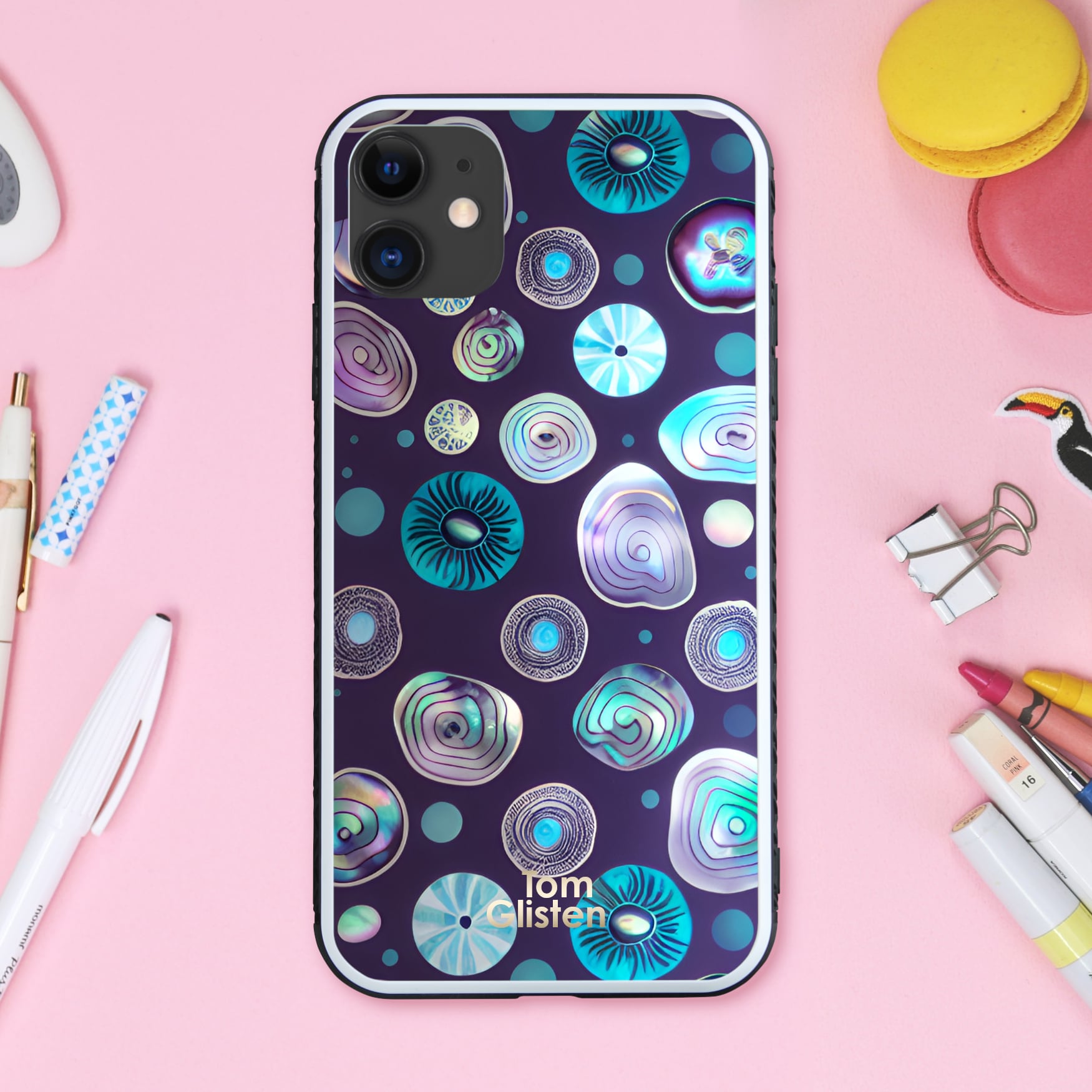 丸いドット柄がゆめかわいいきらびやかなパステルでメルヘンチックなアバロン貝 スマホケース【強化ガラス仕上げ】