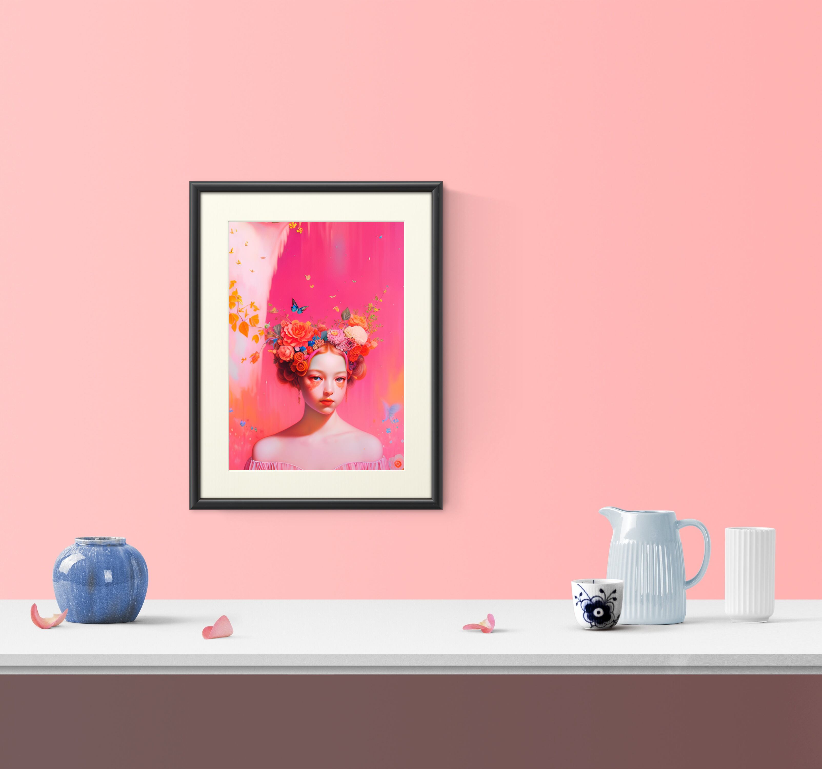 コーラルピンクのパステルカラーで、メルヘンチックな女の子と花や蝶が非日常の世界へ導きます。