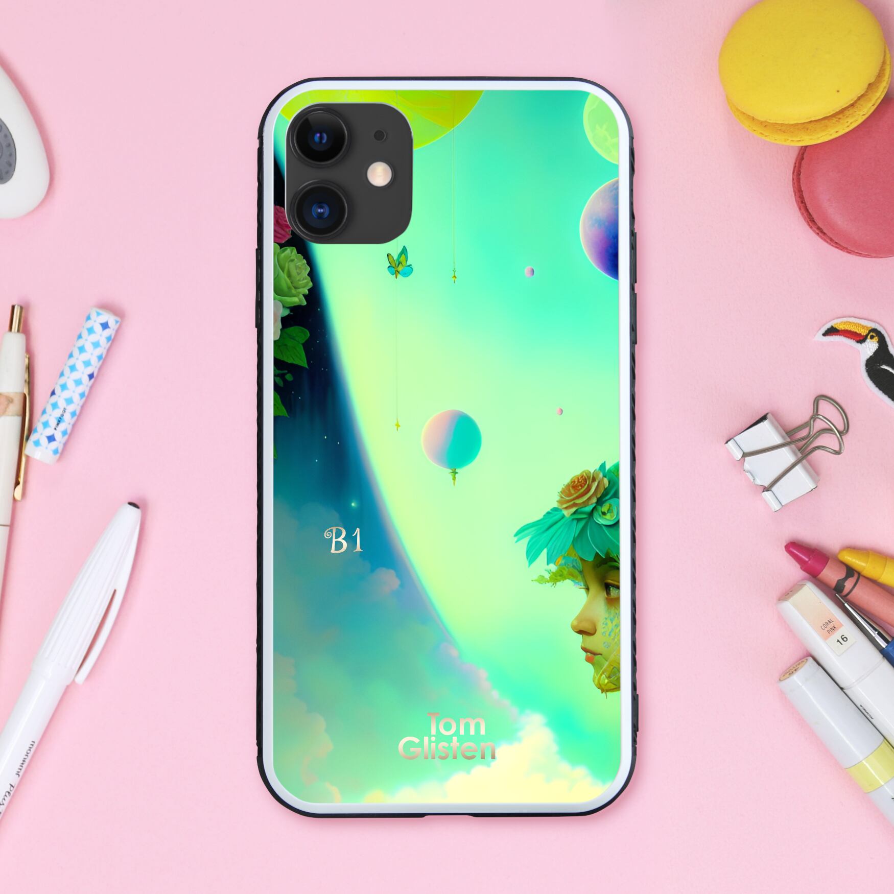 自然とメルヘンチックでゆめかわいい緑色の空と宇宙と女の子 スマホケース【強化ガラス仕上げ】