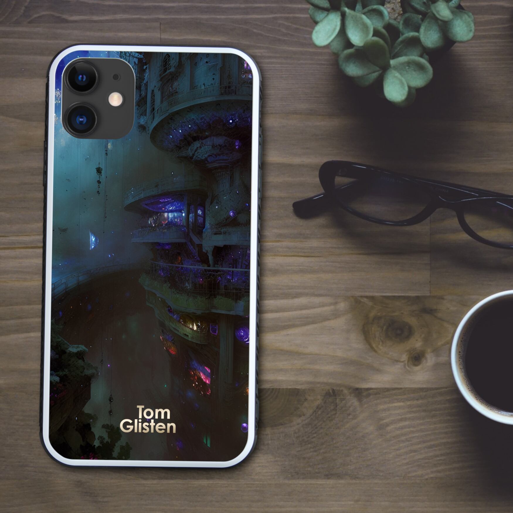 神秘的でネオン色に光る宇宙のような美しい深海都市 スマホケース【強化ガラス仕上げ】