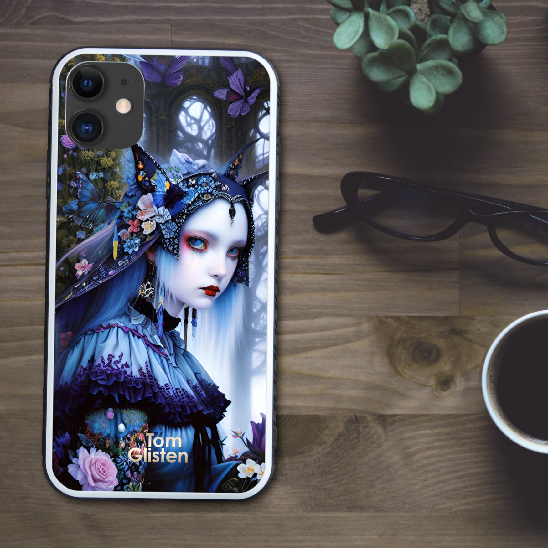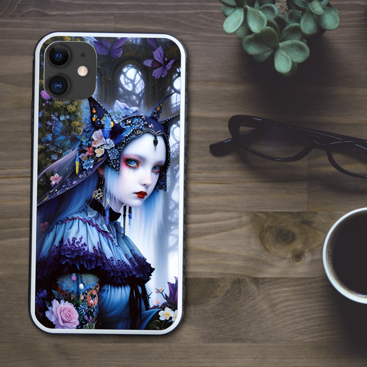 ダークなゴシック調で神秘を感じるきらびやかな森の中の魔女と花や蝶 スマホケース【強化ガラス仕上げ】