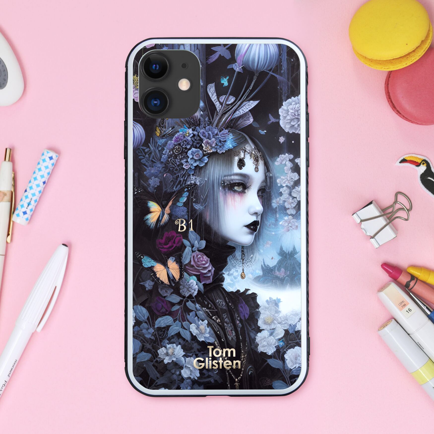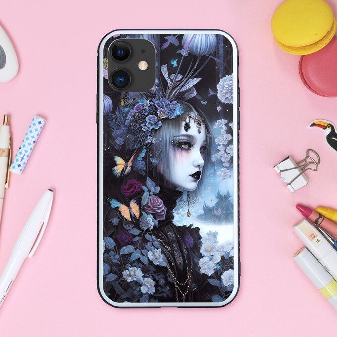 ダークなゴシック調の雰囲気で凛とした魔女と蝶や花 スマホケース【強化ガラス仕上げ】